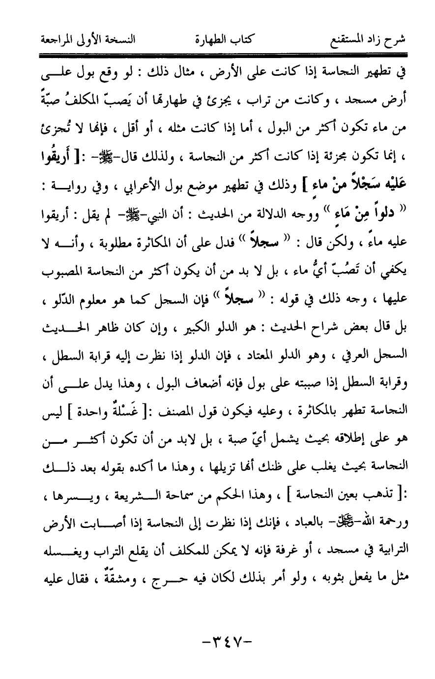 في تطهير النجاسة إذا كانت على الأرض، مثال ذلك: لو وقع بول على أرض مسجد، وكانت من تراب، يجزئ في طهارتها أن يَصبّ المكلفُ صبّةً من ماء تكون أكثر من البول، أما إذا كانت مثله، أو أقل، فإنها لا تُجزئ، إنما تكون مجزئة إذا كانت أكثر من النجاسة، ولذلك قال -صَلَّى اللَّهُ عَلَيْهِ وَسَلَّمَ-: [أَريقُوا عليه سجلاً منْ ماءٍ] وذلك في تطهير موضع بول الأعرابي، وفي رواية: " دلواً مِنْ مَاءٍ " ووجه الدلالة من الحديث: أن النبي -صَلَّى اللَّهُ عَلَيْهِ وَسَلَّمَ- لم يقل: أريقوا عليه ماءً، ولكن قال: " سجلاً " فدل على أن المكاثرة مطلوبة، وأنه لا يكفي أن تَصُبّ أيُّ ماء، بل لا بد من أن يكون أكثر من النجاسة المصبوب عليها، وجه ذلك في قوله: " سجلاً " فإن السجل كما هو معلوم الدّلو، بل قال بعض شراح الحديث: هو الدلو الكبير، وإن كان ظاهر الحديث السجل العرفي، وهو الدلو المعتاد، فإن الدلو إذا نظرت إليه قرابة السطل، وقرابة السطل إذا صببته على بول فإنه أضعاف البول، وهذا يدل على أن النجاسة تطهر بالمكاثرة، وعليه فيكون قول المصنف: [غَسْلةٌ واحدة] ليس هو على إطلاقه بحيث يشمل أيّ صبة، بل لا بد من أن تكون أكثر من النجاسة بحيث يغلب على ظنك أنها تزيلها، وهذا ما أكده بقوله بعد ذلك: [تذهب بعين النجاسة]، وهذا الحكم من سماحة الشريعة، ويسرها، ورحمة الله -عز وجل- بالعباد، فإنك إذا نظرت إلى النجاسة إذا أصابت الأرض الترابية في مسجد، أو غرفة فإنه لا يمكن للمكلف أن يقلع التراب ويغسله مثل ما يفعل بثوبه، ولو أمر بذلك لكان فيه حرج، ومشقّة، فقال عليه