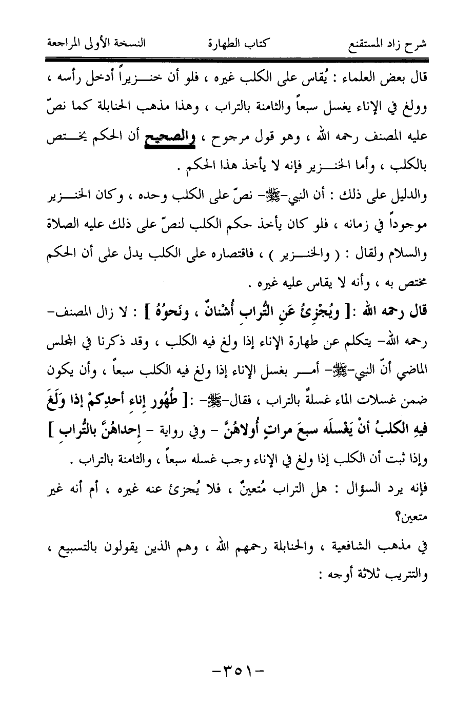 قال بعض العلماء: يُقاس على الكلب غيره، فلو أن خنزيراً أدخل رأسه، وولغ في الإناء يغسل سبعاً والثامنة بالتراب، وهذا مذهب الحنابلة كما نصّ عليه المصنف رحمه الله، وهو قول مرجوح، والصحيح أن الحكم يختص بالكلب، وأما الخنزير فإنه لا يأخذ هذا الحكم.