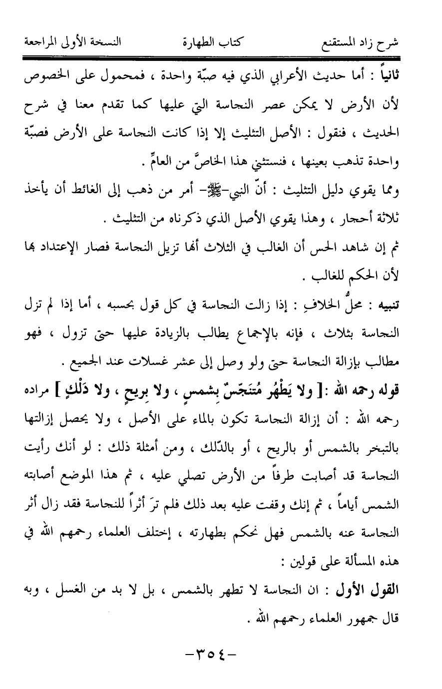 قوله رحمه الله: [ولا يَطْهُر متنَجّسٌ بِشمسٍ، ولا بِريحٍ، ولا دَلْكٍ] مراده رحمه الله: أن إزالة النجاسة تكون بالماء على الأصل، ولا يحصل إزالتها بالتبخر بالشمس أو بالريِح، أو بالدّلك، ومن أمثلة ذلك: لو أنك رأيت النجاسة قد أصابت طرفاً من الأرض تصلي عليه، ثم هذا الموضع أصابته الشمس أياماً، ثم إنك وقفت عليه بعد ذلك فلم ترَ أثراً للنجاسة فقد زال أثر النجاسة عنه بالشمس فهل نحكم بطهارته، إختلف العلماء رحمهم الله في هذه المسألة على قولين: