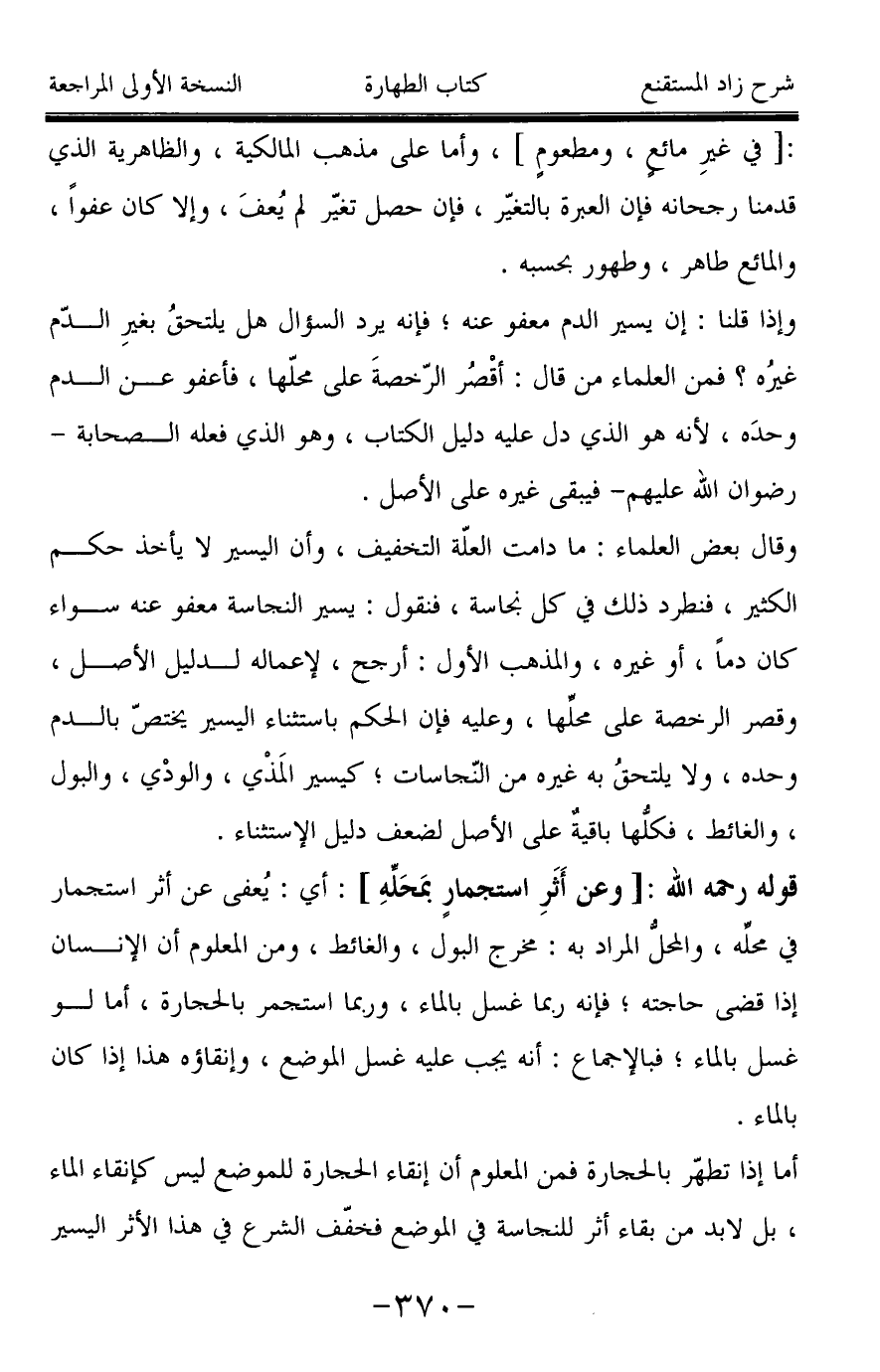 وقال بعض العلماء: ما دامت العلّة التخفيف، وأن اليسير لا يأخذ حكم الكثير، فنطرد ذلك في كل نجاسة، فنقول: يسير النجاسة معفو عنه سواء كان دماً، أو غيره، والمذهب الأول: أرجح، لإعماله لدليل الأصل، وقصر الرخصة على محلِّها، وعليه فإن الحكم باستثناء اليسير يختصّ بالدم وحده، ولا يلتحقُ به غيره من النّجاسات؛ كيسير المَذْي، والودْي، والبول، والغائط، فكلُّها باقيةٌ على الأصل لضعف دليل الإستثناء.
