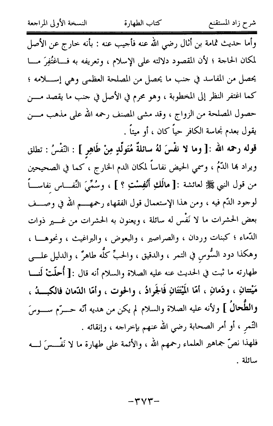 قوله رحمه الله: [وما لا نفْسَ لهُ سائلةٌ مُتَولِّدٍ مِنْ طَاهِر]: النّفْسُ: تطلق ويراد بها الدّمُ، وسمي الحيض نفاساً لمكان الدم الخارج، كما في الصحيحين من قول النبي -صَلَّى اللَّهُ عَلَيْهِ وَسَلَّمَ- لعائشة: [مالَكِ أَنفِسْتِ؟]، وسُمِّيَ النِّفاس نِفاساً لوجود الدّم فيه، ومن هذا الإستعمال قول الفقهاء رحمهم الله في وصف بعض الحشرات ما لا نَفْس له سائلة، ويعنون به الحشرات من غير ذوات الدّماء؟ كبنات وردان، والصراصير، والبعوض، والبراغيث، ونحوها، وهكذا دود السُّوسِ في التمر، والدقيق، والحبّ كلُّه طاهرٌ، والدليل على طهارته ما ثبت في الحديث عنه عليه الصلاة والسلام أنه قال: [أُحلّتْ لنا مَيْتتانِ، ودَمانِ، أمّا المَيْتَتَانِ فَالجَرادُ، والحوت، وأمّا الدّمان فالكبدُ، والطُّحالُ] ولأنه عليه الصلاة والسلام لم يكن من هديه أنه حرّم سوسَ التّمرِ، أو أمر الصحابة رضي الله عنهم بإخراجه، وإنقائه.