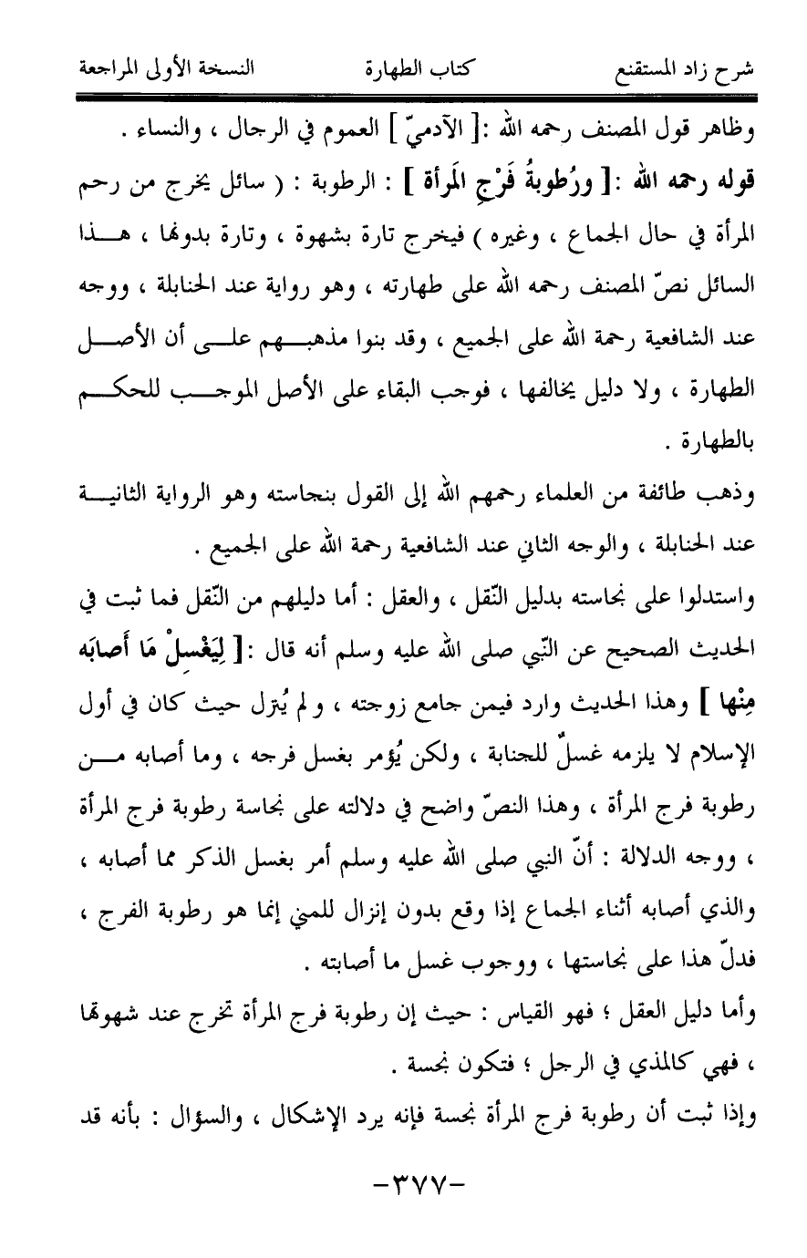 واستدلوا على نجاسته بدليل النّقل، والعقل: أما دليلهم من النّقل فما ثبت في الحديث الصحيح عن النبي صَلَّى اللَّهُ عَلَيْهِ وَسَلَّمَ أنه قال: [لِيَغْسِلْ مَا أَصابه مِنْها] وهذا الحديث وارد فيمن جامع زوجته، ولم يُترل حيث كان في أول الإسلام لا يلزمه غسلٌ للجنابة، ولكن يُؤمر بغسل فرجه، وما أصابه من رطوبة فرج المرأة، وهذا النصّ واضح في دلالته على نجاسة رطوبة فرج المرأة، ووجه الدلالة: أنّ النبي صَلَّى اللَّهُ عَلَيْهِ وَسَلَّمَ أمر بغسل الذكر مما أصابه، والذي أصابه أثناء الجماع إذا وقع بدون إنزال للمني إنما هو رطوبة الفرج، فدلّ هذا على نجاستها، ووجوب غسل ما أصابته.