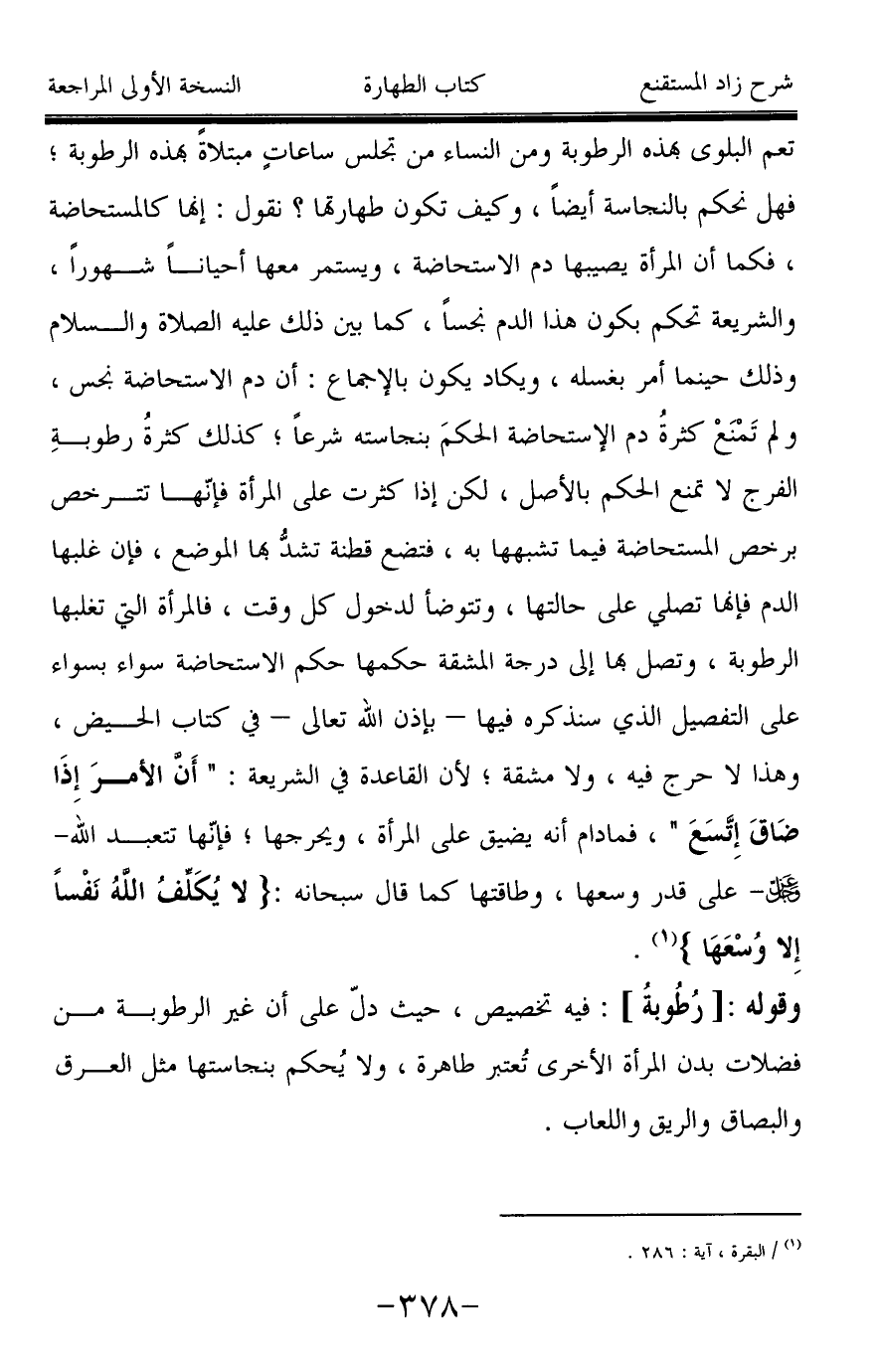 تعم البلوى بهذه الرطوبة ومن النساء من تجلس ساعاتٍ مبتلاةً بهذه الرطوبة؛ فهل نحكم بالنجاسة أيضاً، وكيف تكون طهارتها؟ نقول: إنها كالمستحاضة، فكما أن المرأة يصيبها دم الإستحاضة، ويستمر معها أحياناً شهوراً، والشريعة تحكم بكون هذا الدم نجساً، كما بين ذلك عليه الصلاة والسلام وذلك حينما أمر بغسله، ويكاد يكون بالإجماع: أن دم الإستحاضة نجس، ولم تَمْنَعْ كثرةُ دم الإستحاضة الحكمَ بنجاسته شرعاً؛ كذلك كثرةُ رطوبةِ الفرج لا تمنع الحكم بالأصل، لكن إذا كثرت على المرأة فإنّها تترخص برخص المستحاضة فيما تشبهها به، فتضع قطنة تشدُّ بها الموضع، فإن غلبها الدم فإنها تصلي على حالتها، وتتوضأ لدخول كل وقت، فالمرأة التي تغلبها الرطوبة، وتصل بها إلى درجة المشقة حكمها حكم الإستحاضة سواء بسواء على التفصيل الذي سنذكره فيها -بإذن الله تعالى- في كتاب الحيض، وهذا لا حرج فيه، ولا مشقة؛ لأن القاعدة في الشريعة: " أَنَّ الأمرَ إِذَا ضاقَ إِتَّسَعَ "، فما دام أنه يضيق على المرأة، ويحرجها؛ فإنّها تتعبد الله -عز وجل- على قدر وسعها، وطاقتها كما قال سبحانه: {لَا يُكَلِّفُ اللَّهُ نَفْسًا إِلَّا وُسْعَهَا} (¬1).