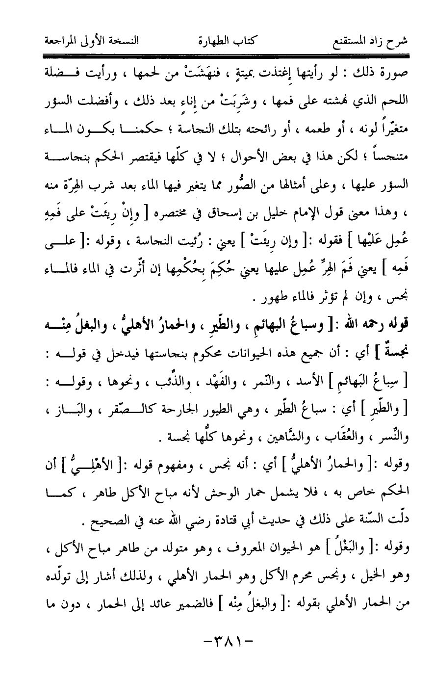 قوله رحمه الله: [وسباعُ البهائمِ، والطّيرِ، والحمارُ الأهليُّ، والبغلُ مِنْه نجسة] أي: أن جميع هذه الحيوانات محكوم بنجاستها فيدخل في قوله: [سِباعُ البَهائمِ] الأسد، والنّمر، والفَهْد، والذِّئب، ونحوها، وقوله: [والطّيرِ] أي: سباعُ الطّير، وهي الطيور الجارحة كالصّقر، والبَاز، والنّسر، والعُقَاب، والشَّاهين، ونحوها كلُّها نجسة.