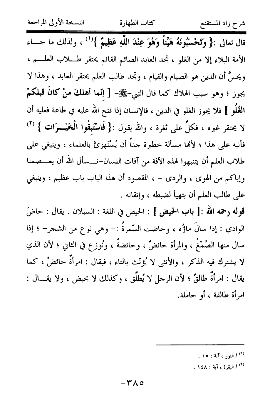قال تعالى: {وَتَحْسَبُونَهُ هَيِّنًا وَهُوَ عِنْدَ اللَّهِ عَظِيمٌ} (¬1)، ولذلك ما جاء الأمة البلاء إلا من الغلو، تجد العابد الصائم القائم يحتقر طلاب العلم، ويحسَّ أن الدين هو الصيام والقيام، وتجد طالب العلم يحتقر العابد، وهذا لا يجوز؛ وهو سبب الهلاك كما قال النبي -صَلَّى اللَّهُ عَلَيْهِ وَسَلَّمَ-[إنما أهلكَ منْ كانَ قبلكمْ الغُلُو] فلا يجوز الغلو في الدين، فالإنسان إذا فتح الله عليه في طاعة فعليه أن لا يحتقر غيره، فكل على ثغرة، والله يقول: {فَاسْتَبِقُوا الْخَيْرَاتِ} (¬2) فأنبه على هذا؛ لأنها مسألة خطيرة جداً أن يُستهزئَ بالعلماء، وينبغي على طلاب العلم أن يتنبهوا لهذه الآفة من آفات اللسان -نسأل الله أن يعصمنا وإياكم من الهوى، والردى-، المقصود أن هذا الباب باب عظيم، وينبغي على طالب العلم أن يتهيأ لضبطه، وإتقانه.