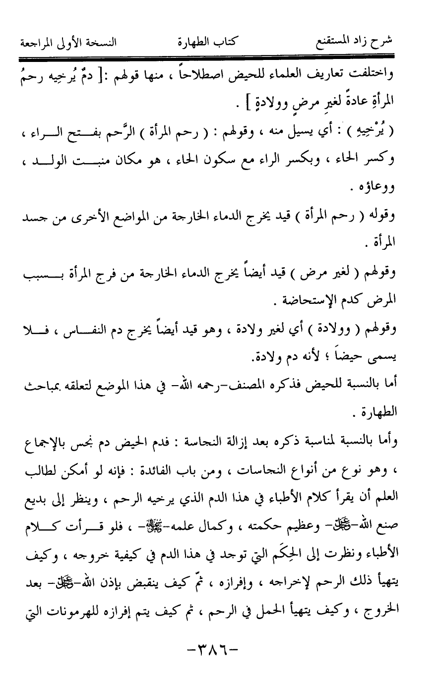 وأما بالنسبة لمناسبة ذكره بعد إزالة النجاسة: فدم الحيض دم نجس بالإجماع، وهو نوع من أنواع النجاسات، ومن باب الفائدة: فإنه لو أمكن لطالب العلم أن يقرأ كلام الأطباء في هذا الدم الذي يرخيه الرحم، وينظر إلى بديع صنع الله -عز وجل- وعظيم حكمته، وكمال علمه -سبحانه وتعالى-، فلو قرأت كلام الأطباء ونظرت إلى الحِكَم التي توجد في هذا الدم في كيفية خروجه، وكيف يتهيأ ذلك الرحم لإخراجه، وإفرازه، ثمّ كيف ينقبض بإذن الله -عز وجل- بعد الخروج، وكيف يتهيأ الحمل في الرحم، ثم كيف يتم إفرازه للهرمونات التي