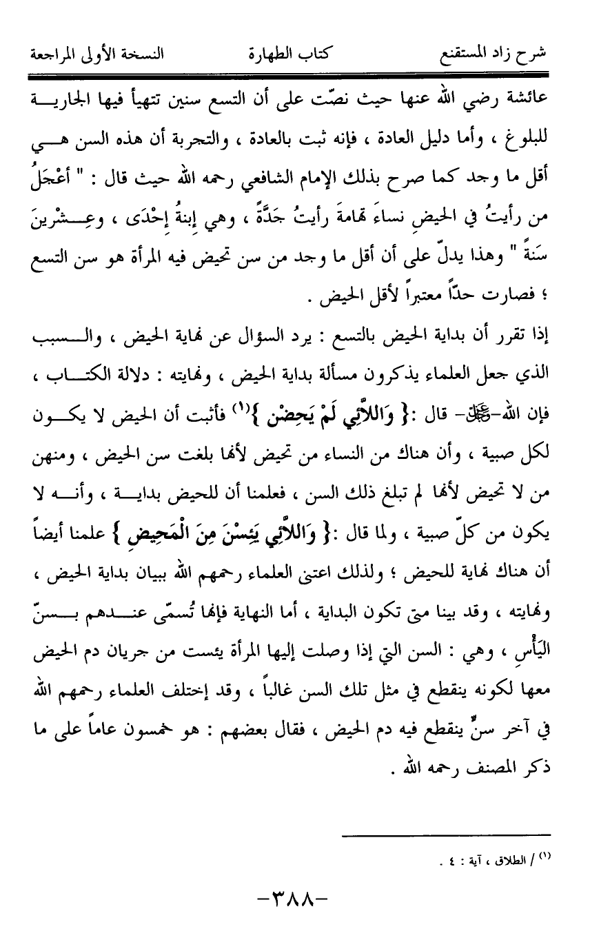 إذا تقرر أن بداية الحيض بالتسع: يرد السؤال عن نهاية الحيض، والسبب الذي جعل العلماء يذكرون مسألة بداية الحيض، ونهايته: دلالة الكتاب، فإن الله -عز وجل- قال: {وَاللَّائِي لَمْ يَحِضْنَ} (¬1) فأثبت أن الحيض لا يكون لكل صبية، وأن هناك من النساء من تحيض لأنها بلغت سن الحيض، ومنهن من لا تحيض لأنها لم تبلغ ذلك السن، فعلمنا أن للحيض بداية، وأنه لا يكون من كلّ صبية، ولما قال: {وَاللَّائِي يَئِسْنَ مِنَ الْمَحِيضِ} علمنا أيضاً أن هناك نهاية للحيض؛ ولذلك اعتنى العلماء رحمهم الله ببيان بداية الحيض، ونهايته، وقد بينا متى تكون البداية، أما النهاية فإنها تُسمّى عندهم بسنّ اليَأْسِ، وهي: السن التي إذا وصلت إليها المرأة يئست من جريان دم الحيض معها لكونه ينقطع في مثل تلك السن غالباً، وقد إختلف العلماء رحمهم الله في آخر سن ينقطع فيه دم الحيض، فقال بعضهم: هو خمسون عاماً على ما ذكر المصنف رحمه الله.