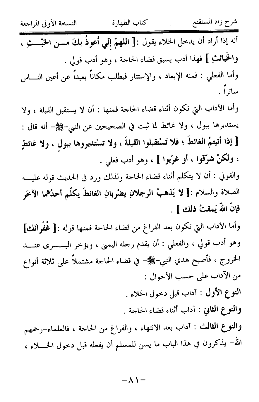 والنوع الثالث: آداب بعد الانتهاء، والفراغ من الحاجة، فالعلماء -رحمهم الله- يذكرون في هذا الباب ما يسن للمسلم أن يفعله قبل دخول الخلاء،