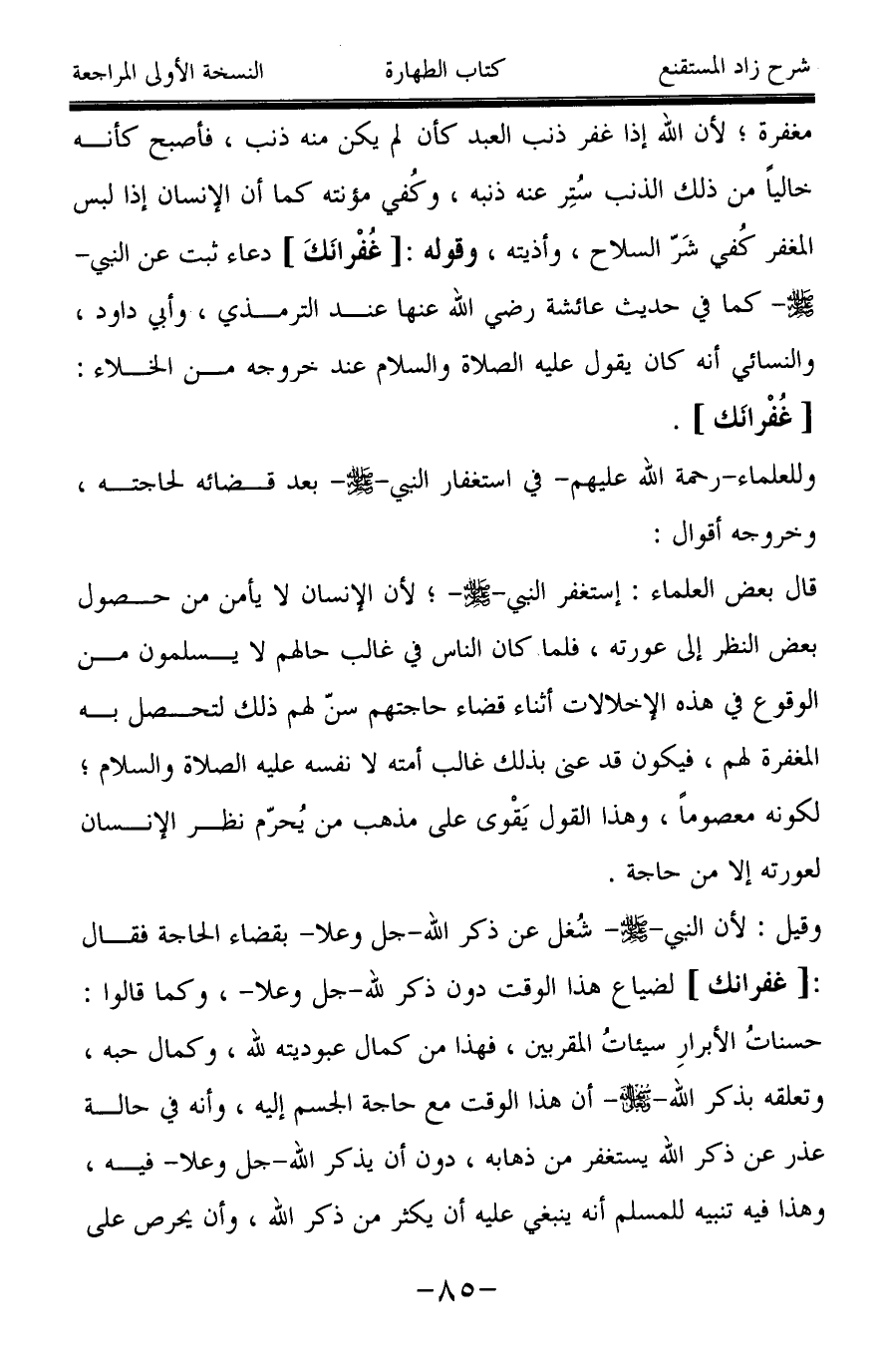 وقيل: لأن النبي -صَلَّى اللَّهُ عَلَيْهِ وَسَلَّمَ- شُغل عن ذكر الله -جل وعلا- بقضاء الحاجة فقال: [غفرانك] لضياع هذا الوقت دون ذكر لله -جل وعلا-، وكما قالوا: حسناتُ الأبرارِ سيئاتُ المقربين، فهذا من كمال عبوديته لله، وكمال حبه، وتعلقه بذكر الله -سبحانه وتعالى- أن هذا الوقت مع حاجة الجسم إليه، وأنه في حالة عذر عن ذكر الله يستغفر من ذهابه، دون أن يذكر الله -جل وعلا- فيه، وهذا فيه تنبيه للمسلم أنه ينبغي عليه أن يكثر من ذكر الله، وأن يحرص على