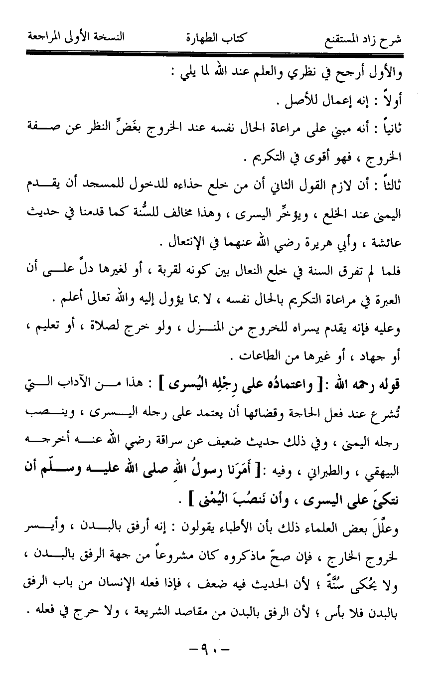 ثالثاً: أن لازم القول الثاني أن من خلع حذاءه للدخول للمسجد أن يقدم اليمنى عند الخلع، ويؤخِّر اليسرى، وهذا مخالف للسُّنة كما قدمنا في حديث عائشة، وأبي هريرة رضي الله عنهما في الانتعال.