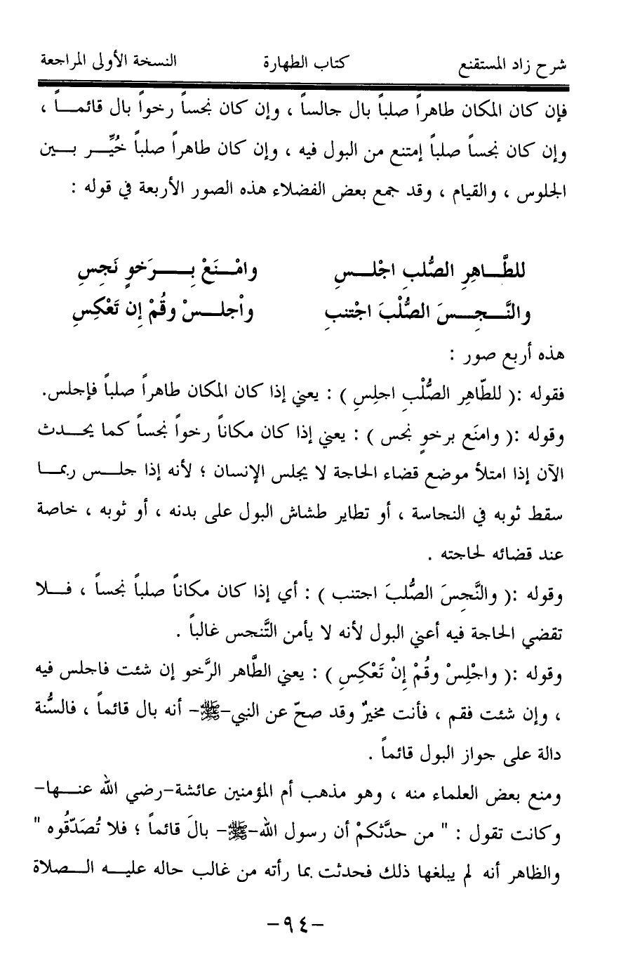فإن كان المكان طاهراً صلباً بال جالساً، وإن كان نجساً رخواً بال قائماً، وإن كان نجساً صلباً إمتنع من البول فيه، وإن كان طاهراً صلباً خُيِّر بين الجلوس، والقيام، وقد جمع بعض الفضلاء هذه الصور الأربعة في قوله: