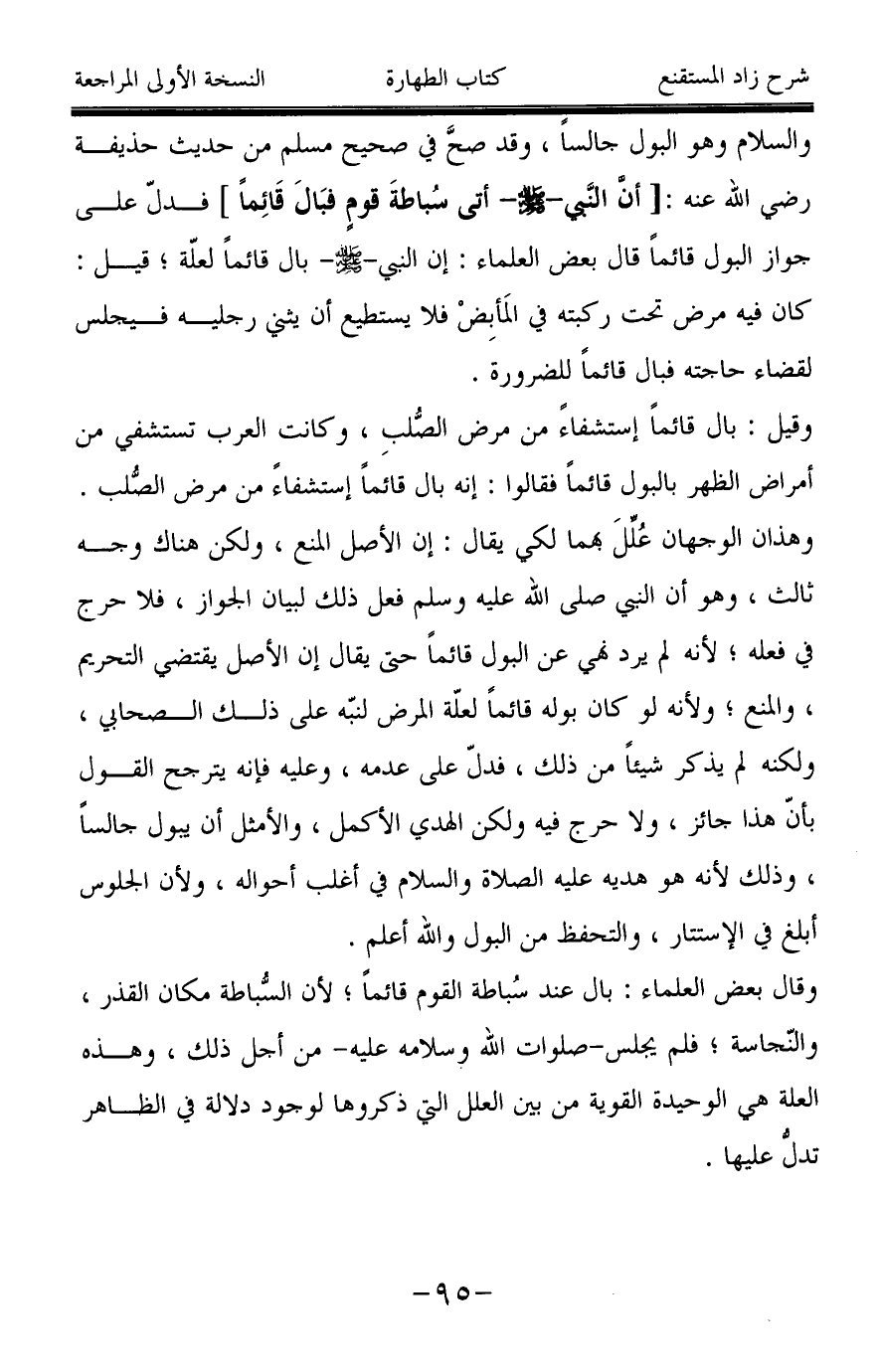والسلام وهو البول جالساً، وقد صحَّ في صحيح مسلم من حديث حذيفة رضي الله عنه: [أن النبي -صَلَّى اللَّهُ عَلَيْهِ وَسَلَّمَ- أتى سُباطةَ قومٍ فبَالَ قَائِماً] فدلّ على جواز البول قائماً قال بعض العلماء: إن النبي -صَلَّى اللَّهُ عَلَيْهِ وَسَلَّمَ- بال قائماً لعلّة؛ قيل: كان فيه مرض تحت ركبته في المَأبِضْ فلا يستطيع أن يثني رجليه فيجلس لقضاء حاجته فبال قائماً للضرورة.