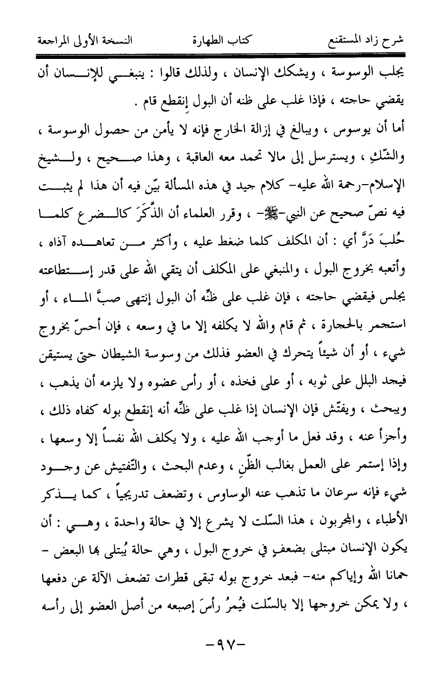 يجلب الوسوسة، ويشكك الإنسان، ولذلك قالوا: ينبغى للإنسان أن يقضي حاجته، فإذا غلب على ظنه أن البول إِنقطع قام.