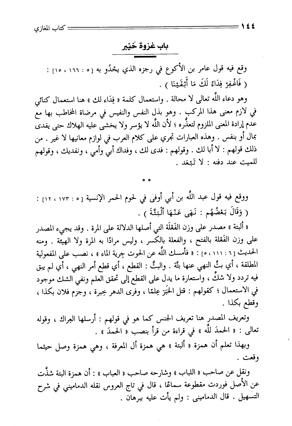 وتعريف المصدر هنا تعريف الجنس كما هو في قولهم: أرسلها العراك، وقوله تعالى: «الحمد لله» في قراءة من قرأ بنصب «الحمد».