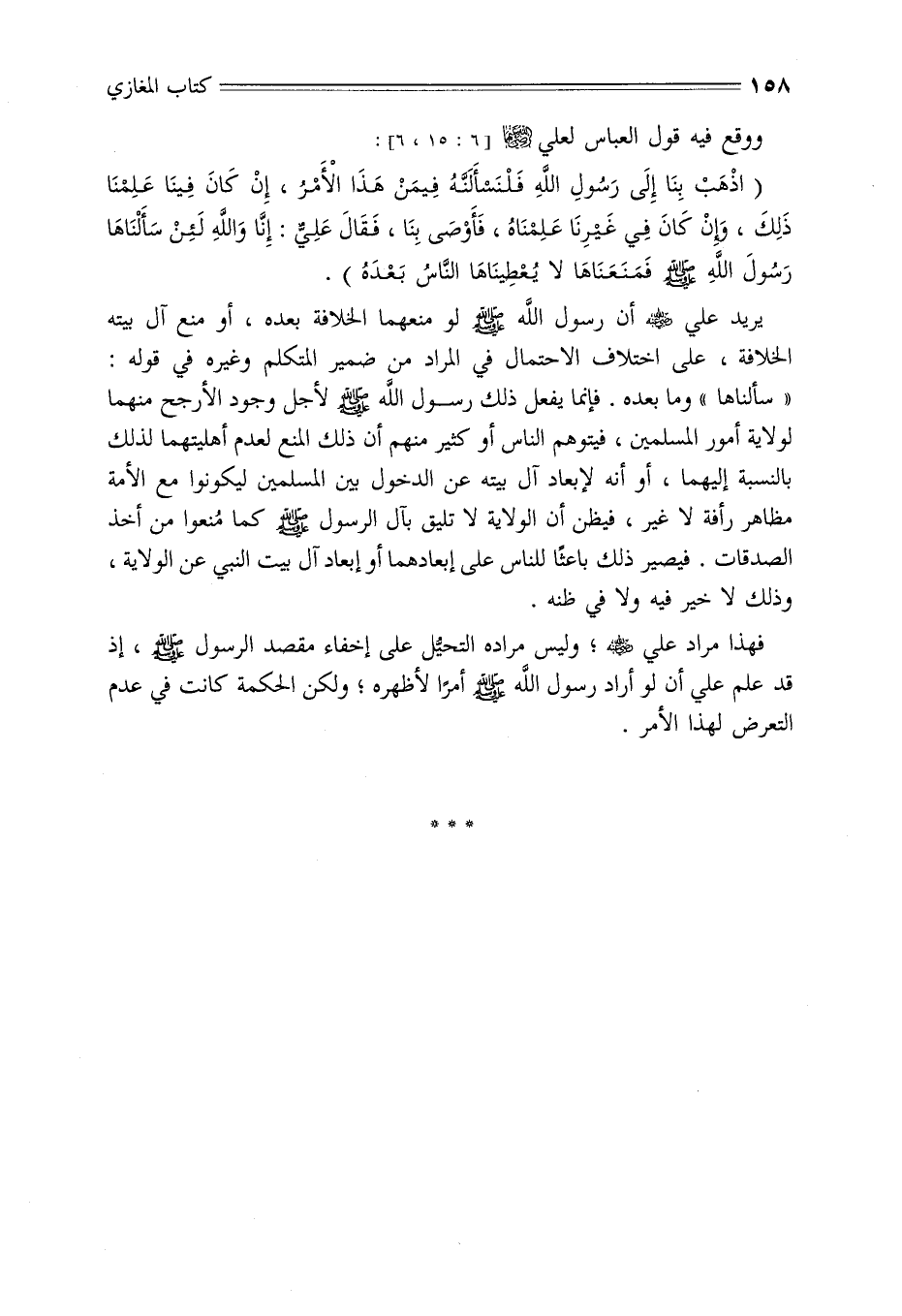 (اذهب بنا إلى رسول الله فلنسألنه فيمن هذا الأمر، إن كان فينا علمنا ذلك، وإن كان في غيرنا علمناه، فأوصى بنا، فقال علي: إنا لله لئن سألناها رسول الله - صلى الله عليه وسلم - لو منعهما الخلافة بعده، أو منع آل بيته الخلافة، على اختلاف الاحتمال في المراد من ضمير المتكلم وغيره في قوله: «سألناها» وما بعده. فإنما يفعل ذلك رسول الله - صلى الله عليه وسلم - لأجل وجود الأرجح منهما لولاية أمور المسلمين، فيتوهم الناس أو كثير منهم أن ذلك المنع لعدم أهليتهما لذلك بالنسبة إليهما، أو أنه لإبعاد آل بيته عن الدخول بين المسلمين ليكونوا مع الأمة مظاهر رأفة لا غير، فيظن أن الولاية لا تليق بآل الرسول - صلى الله عليه وسلم - كما مُنعوا من أخذ الصدقات. فيصير ذلك باعثًا للناس على إبعادهما أو إبعاد آل بيت النبي عن الولاية، وذلك لا خير فيه ولا في ظنه.