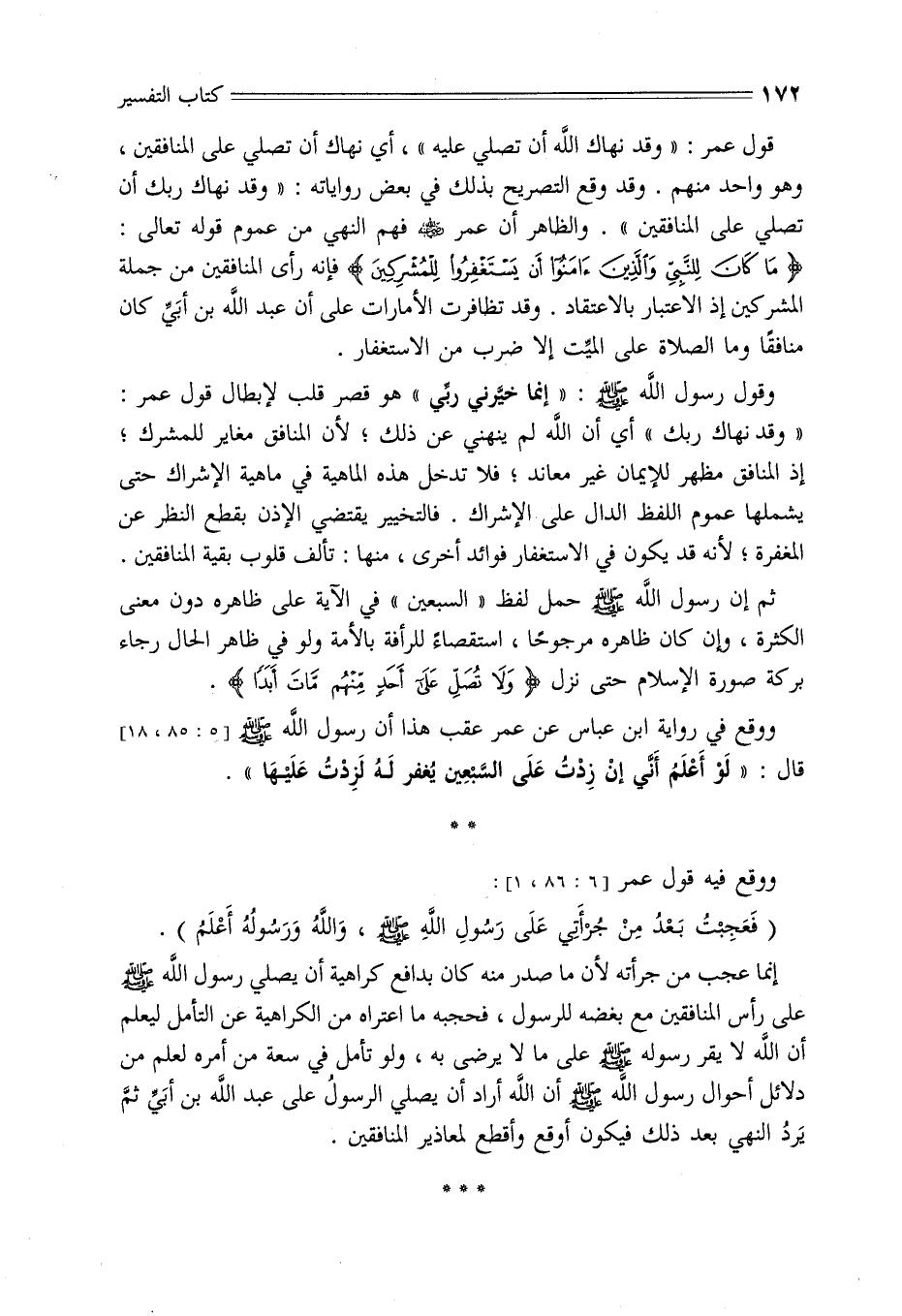 ثم إن رسول الله - صلى الله عليه وسلم - حمل لفظ «السبعين» في الآية على ظاهره دون معنى الكثرة، وإن كان ظاهره مرجوحًا، استقصاء للرأفة بالأمة ولو في ظاهر الحال رجاء بركة صورة الإسلام حتى نزل {وَلَا تُصَلِّ عَلَى أَحَدٍ مِنْهُمْ مَاتَ أَبَدًا} [التوبة: 84].