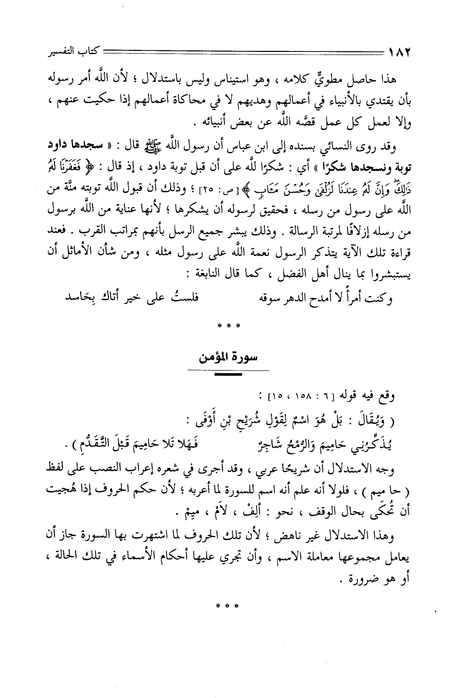 وقد روى النسائي بسنده إلى ابن عباس أن رسول الله - صلى الله عليه وسلم - قال: «سجدها داود توبة ونسجدها شكرًا» أي: شكرًا لله على أن قبل توبة داود، إذ قال: {فَغَفَرْنَا لَهُ ذَلِكَ وَإِنَّ لَهُ عِنْدَنَا لَزُلْفَى وَحُسْنَ مَآَبٍ} [ص: 25]؛ وذلك أن قبول الله توبته منة من الله على رسول من رسله، فحقيق لرسوله أن يشكرها؛ لأنها عناية من الله برسول من رسله إزلافًا لمرتبة الرسالة. وذلك يبشر جميع الرسل بأنهم بمراتب القرب. فعند قراءة تلك الآية يتذكر الرسول نعمة الله على رسول مثله، ومن شأن الأماثل أن يستبشروا بما ينال أهل الفضل، كما قال النابغة: