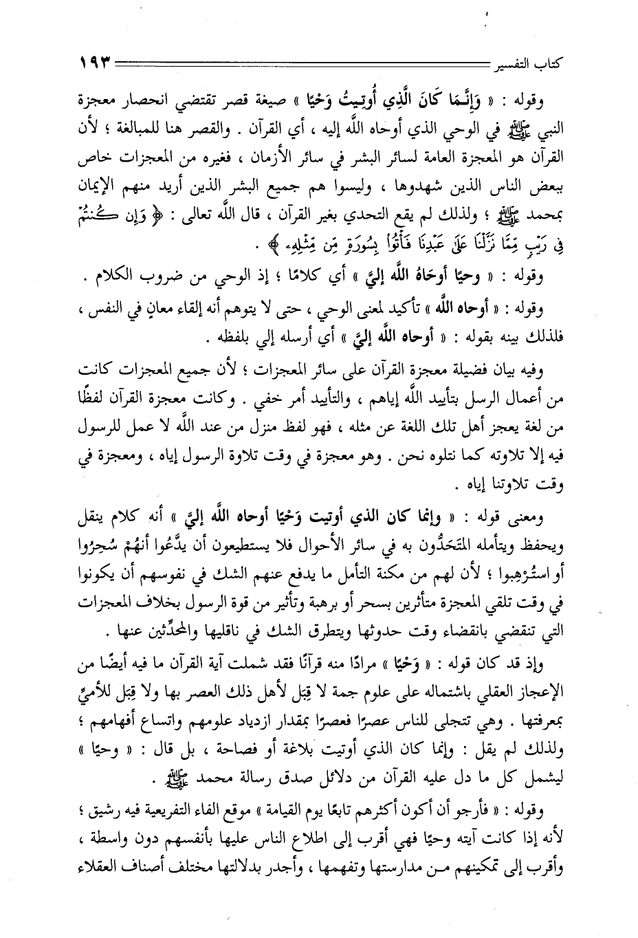 ومعنى قوله: «وإنما كان الذي أوتيت وَحْياً أوحاه الله إليَّ» أنه كلام ينقل ويحفظ ويتأمله المتَحَدُّون به في سائر الأحوال فلا يستطيعون أن يدَّعُوا أنهُمْ سُحِرُوا أو استُرْهِبوا؛ لأن لهم من مكنة التأمل ما يدفع عنهم الشك في نفوسهم أن يكونوا في وقت تلقي المعجزة متأثرين بسحر أو برهبة وتأثير من قوة الرسول بخلاف المعجزات التي تنقضي بانقضاء وقت حدوثها ويتطرق الشك في ناقليها والمحدِّثين عنها.