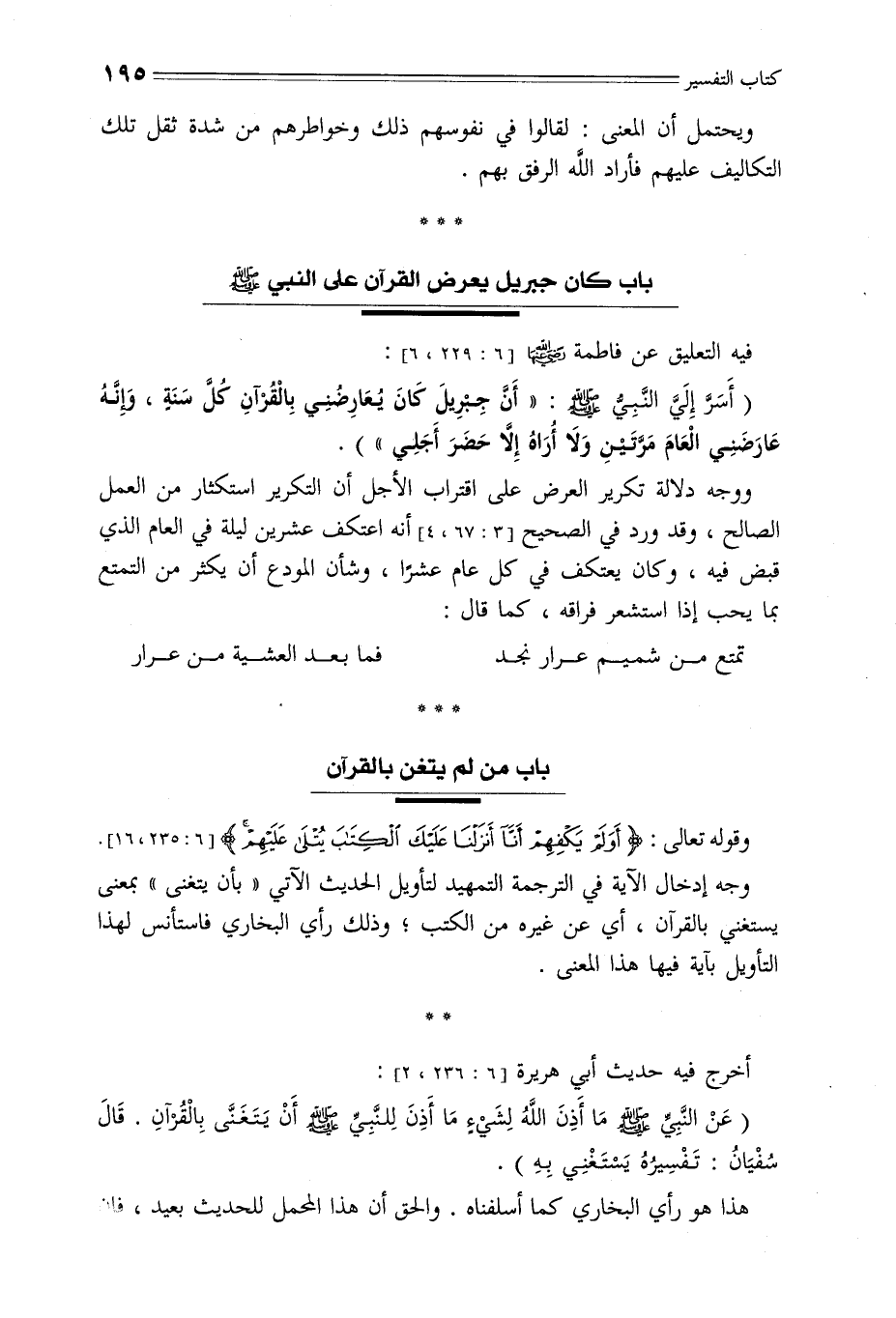 ووجه دلالة تكرير العرض على اقتراب الأجل أن التكرير استكثار من العمل الصالح، وقد ورد في الصحيح [3: 67، 4] أنه اعتكف عشرين ليلة في العام الذي قبض فيه، وكان يعتكف في كل عام عشراً، وشأن المودع أن يكثر من التمتع بما يحب إذا استشعر فراقه، كما قال: