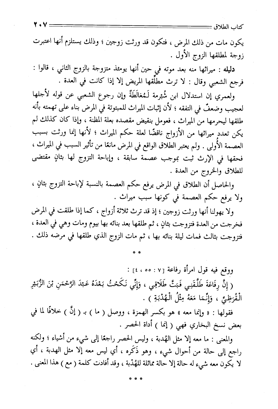 دليله: ميراثها منه بعد موته في حين أنها يومئذ متزوجة بالزوج الثاني، قالوا: فرجع الشعبي وقال: لا ترث مطلِّقها المريض إلا إذا كانت في العدة.