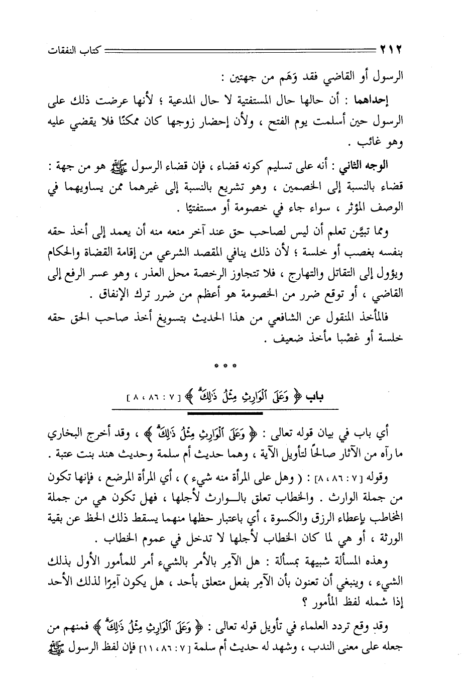 وقد وقع تردد العلماء في تأويل قوله تعالى: {وعَلَى الوَارِثِ مِثْلُ ذَلِكَ} فمنهم من جعله على معنى الندب، وشهد له حديث أم سلمة [7: 86، 11] فإن لفظ الرسول - صلى الله عليه وسلم -
