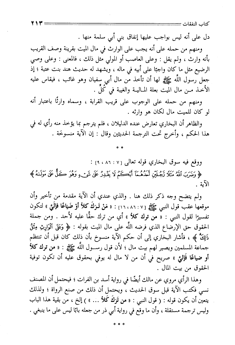 ولم يتضح وجه ذكر ذلك هنا. والذي عندي أن الآية مقدمة من تأخير وأن موقعها عقب قول النبي - صلى الله عليه وسلم -[7: 86، 16]: «مَنْ تَرَكَ كلأ أو ضياعاً فإليَّ» لتكون تفسيراً لقول النبي: «من ترك كلأ» أي من ترك حقّاً عليه لأحد. ومن جملة الحقوق حق الإرضاع الذي فرضه الله على مال الميت بقوله: {وعَلَى الوَارِثِ مِثْلُ ذَلِكَ {، فأشار البخاري إلى أن حكم الآية منسوخ بأن ذلك كان قبل أن تنتظم جماعة المسلمين ويصير لهم بيت مال؛ لأن قول رسول الله - صلى الله عليه وسلم -: «من ترك كلأ أو ضياعاً فإليَّ» صريح في أن من لا مال له يوفي بحقوق عليه أن تكون توفية الحقوق من بيت المال.