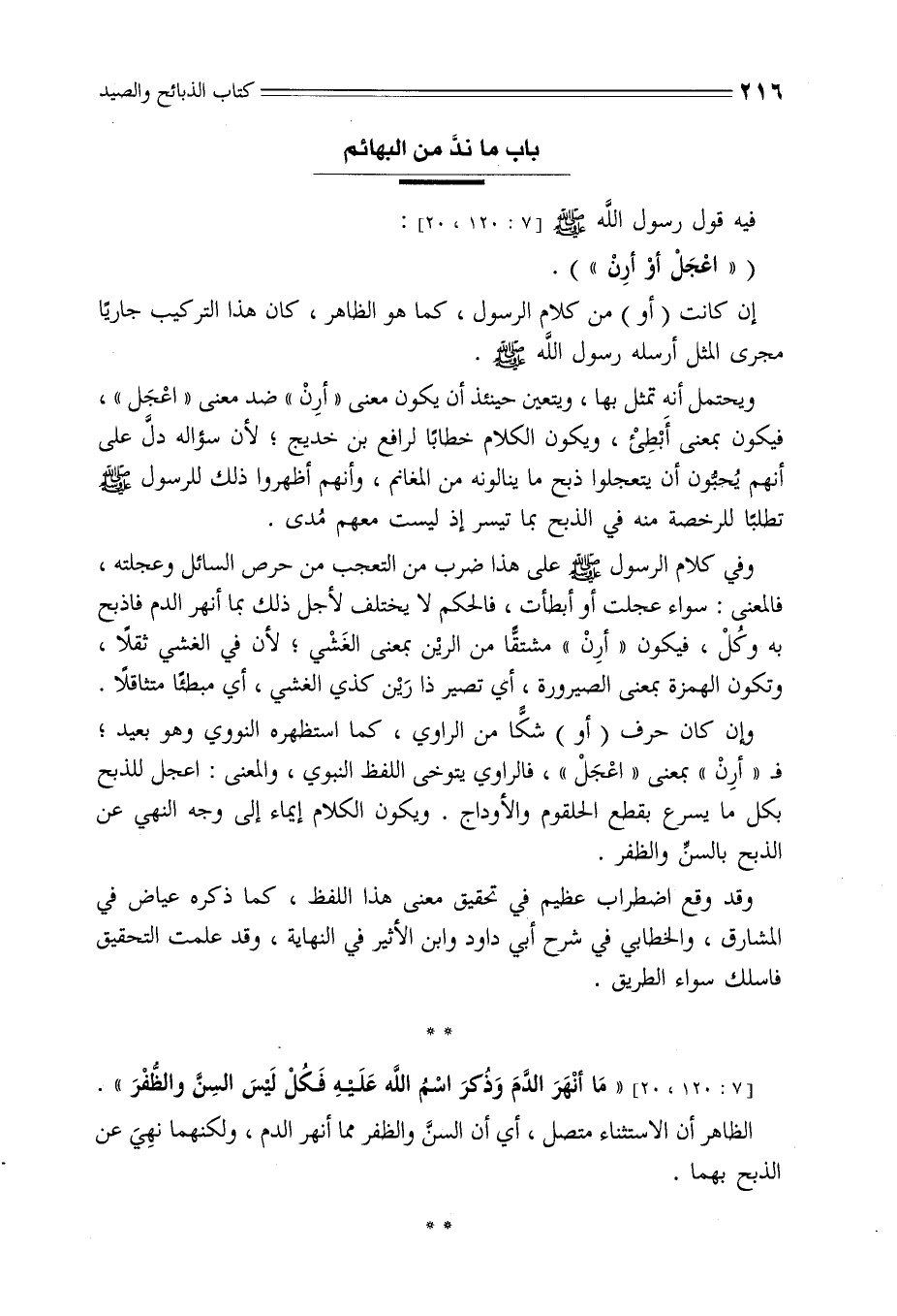 وفي كلام الرسول - صلى الله عليه وسلم - على هذا ضرب من التعجب من حرص السائل وعجلته، فالمعنى: سواء عجلت أو أبطأت، فالحكم لا يختلف لأجل ذلك بما أنهر الدم فاذبح به وكُلْ، فيكون «أرِنْ» مشتقّاً من الريْن بمعنى الغَشْي؛ لأن في الغشي ثقلاً، وتكون الهمزة بمعنى الصيرورة، أي تصير ذا رَيْن كذي الغشي، أي مبطئاً متثاقلاً.