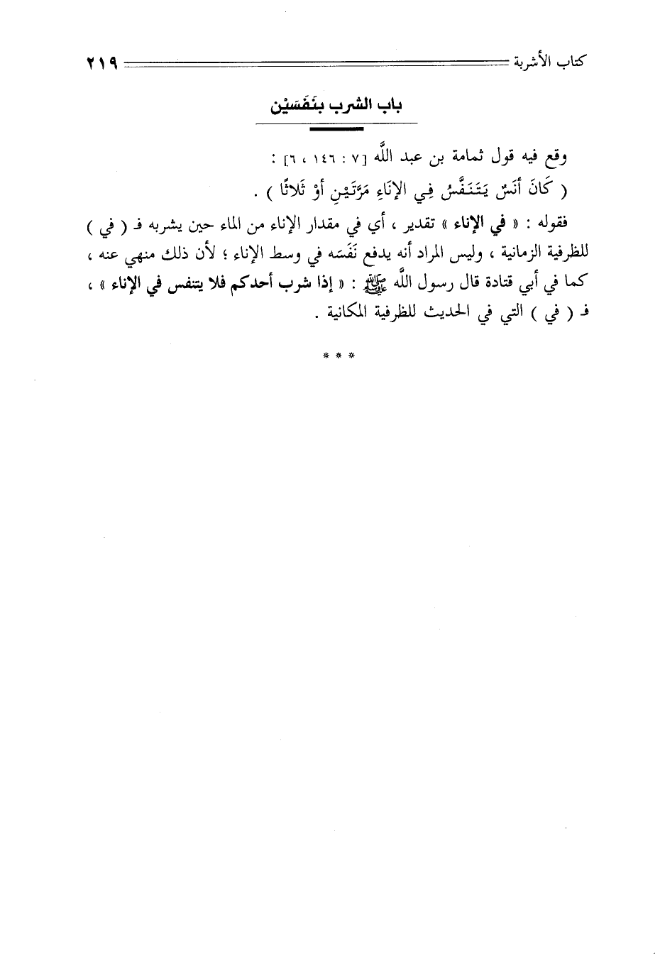 (كان أنسٌ ينتفَّسُ في الإناءِ مرَّتينِ أو ثلاثاً).