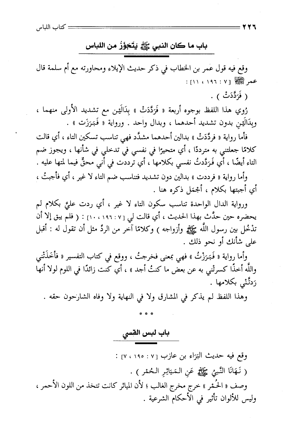 وقع فيه قول عمر بن الخطاب في ذكر حديث الإيلاء ومحاورته مع أم سلمة قال عمر - رضي الله عنه -[7: 196، 11]: