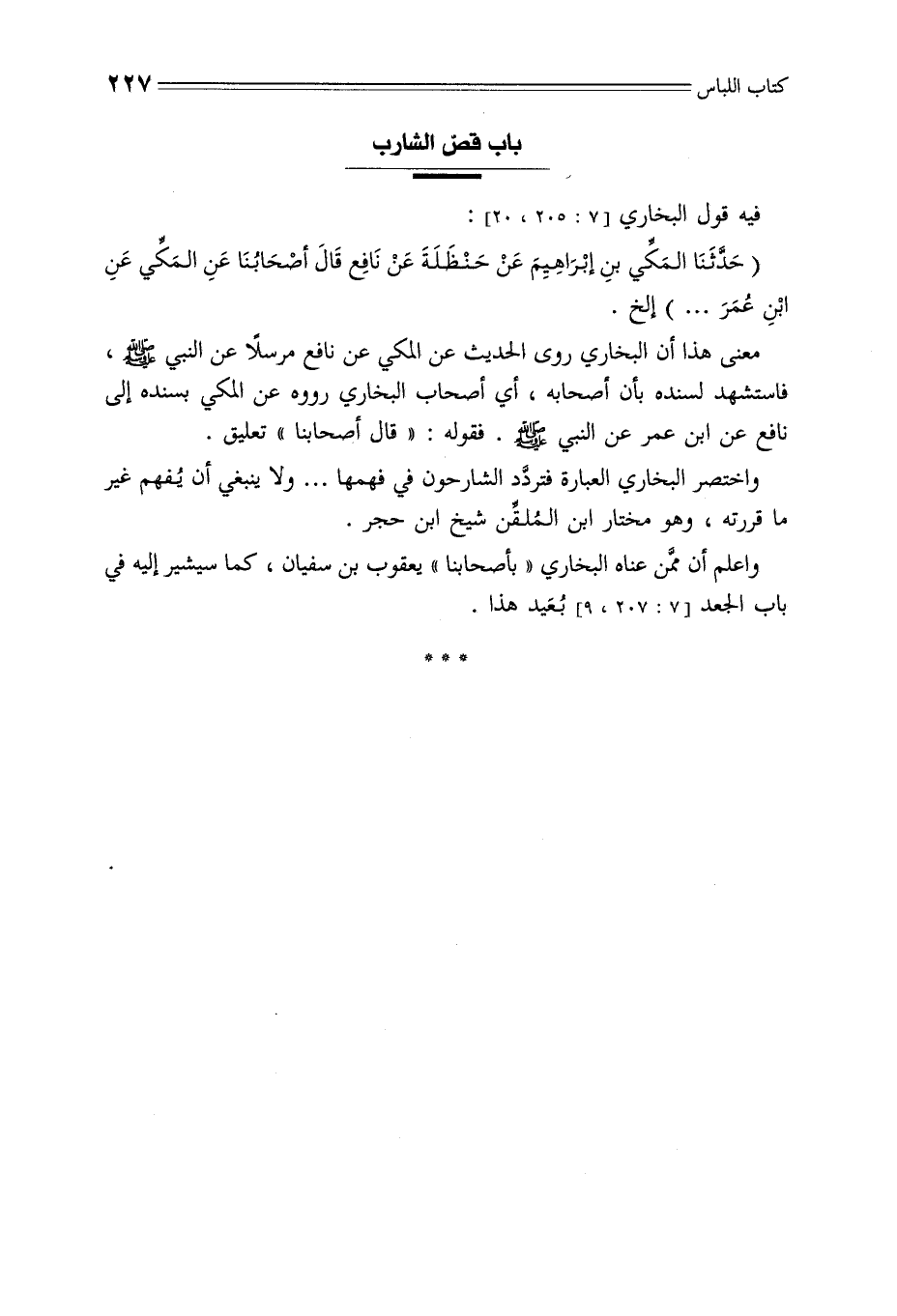 معنى هذا أن البخاري روى الحديث عن المكي عن نافع مرسلاً عن النبي - صلى الله عليه وسلم -، فاستشهد لسنده بأن أصحابه، أي أصحاب البخاري رووه عن المكي بسنده إلى نافع عن ابن عمر عن النبي - صلى الله عليه وسلم -. فقوله: «قال أصحابنا» تعليق.