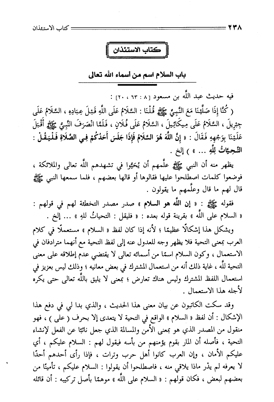 ويشكل هذا إشكالاً عظيماً؛ لأنه إذا كان لفظ «السلام» مستعملاً في كلام العرب بمعنى التحية فلا يظهر وجه للعدول عنه إلى لفظ التحية مع أنهما مترادفان في الاستعمال، وكون السلام اسماً من أسمائه تعالى لا يقتضي عدم إطلاقه على معنى التحية لله، غاية ذلك أنه من استعمال المشترك في بعض معانيه؛ وذلك ليس بعزيز في استعمال اللفظ المشترك وليس هناك تعارض؛ بمعنى لا يليق بالله تعالى حتى يكره لأجله هذا الاستعمال.