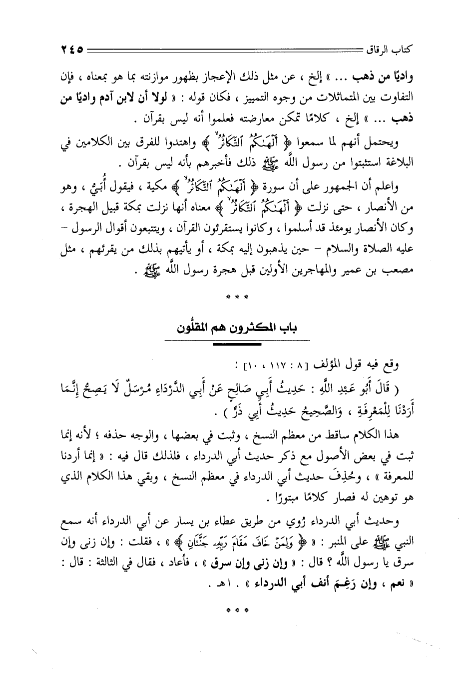 هذا الكلام ساقط من معظم النسخ، وثبت في بعضها، والوجه حذفه؛ لأنه إنما ثبت في بعض الأصول مع ذكر حديث أبي الدرداء، فلذلك قال فيه: «إنما أردنا للمعرفة»، وحُذِفَ حديث أبي الدرداء في معظم النسخ، وبقي هذا الكلام الذي هو توهين له فصار كلامًا مبتورًا.