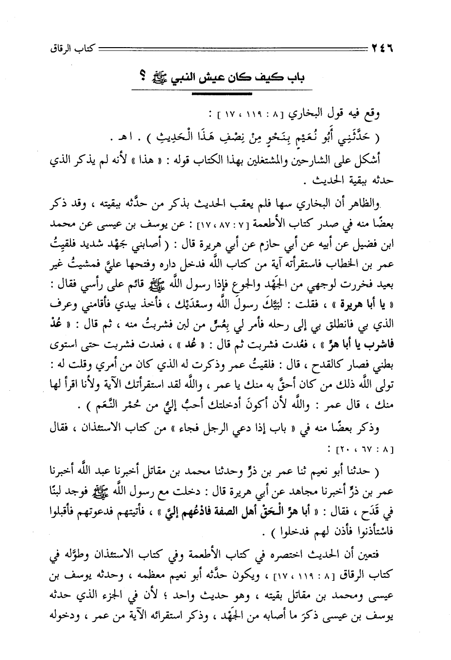 فتعين أن الحديث اختصره في كتاب الأطعمة وفي كتاب الاستئذان وطوَّله في كتاب الرقاق [119: 8، 17]، ويكون حدَّثه أبو نعيم معظمه، وحدثه يوسف بن عيسى ومحمد بن مقاتل بقيته، وهو حديث واحد؛ لأن في الجزء الذي حدثه يوسف بن عيسى ذكرَ ما أصابه من الجَهْد، وذكر استقرائه الآية من عمر، ودخوله