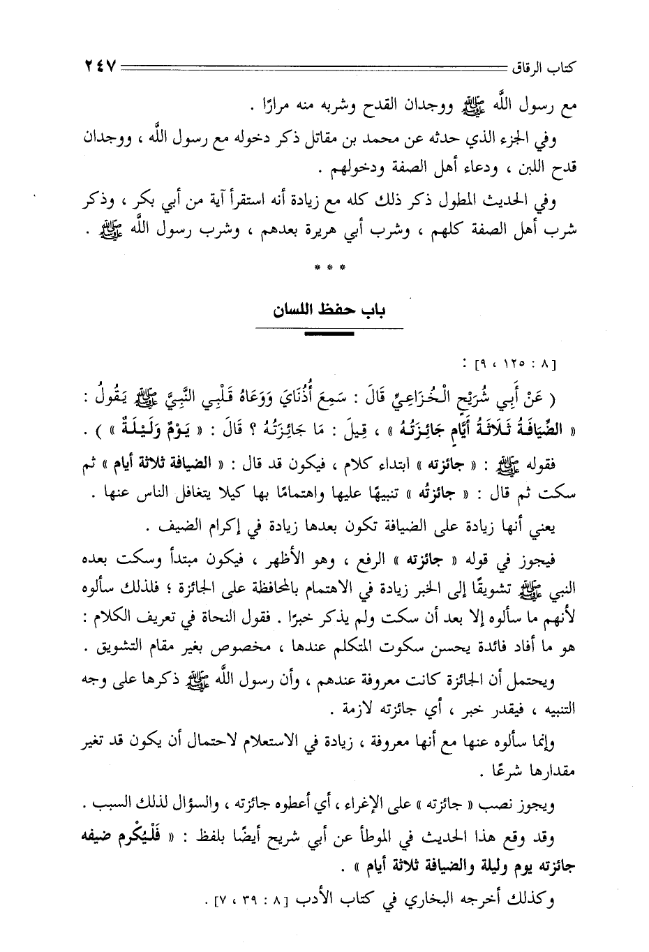 (عن أبي شريحٍ الخزاعيِّ قال: سمع أذناي ووعاه قلبي النَّبيَّ - صلى الله عليه وسلم - يقول: «الضِّيافة ثلاثة أيَّامٍ جائزته»، قيل: ما جائزته؟ قال: «يومٌ وليلةٌ»).