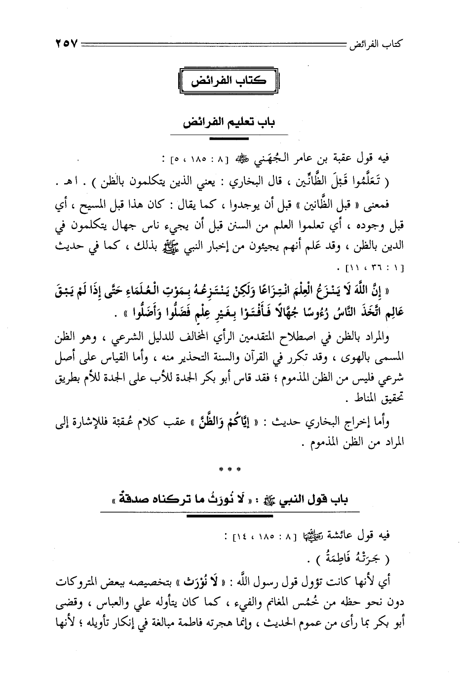 أي لأنها كانت تؤول قول رسول الله: «لا نورث» بتخصيصه ببعض المتروكات دون نحو حظه من خُمُس المغانم والفيء، كما كان يتأوله علي والعباس، وقضى أبو بكر بما رأى من عموم الحديث، وإنما هجرته فاطمة مبالغة في إنكار تأويله؛ لأنها