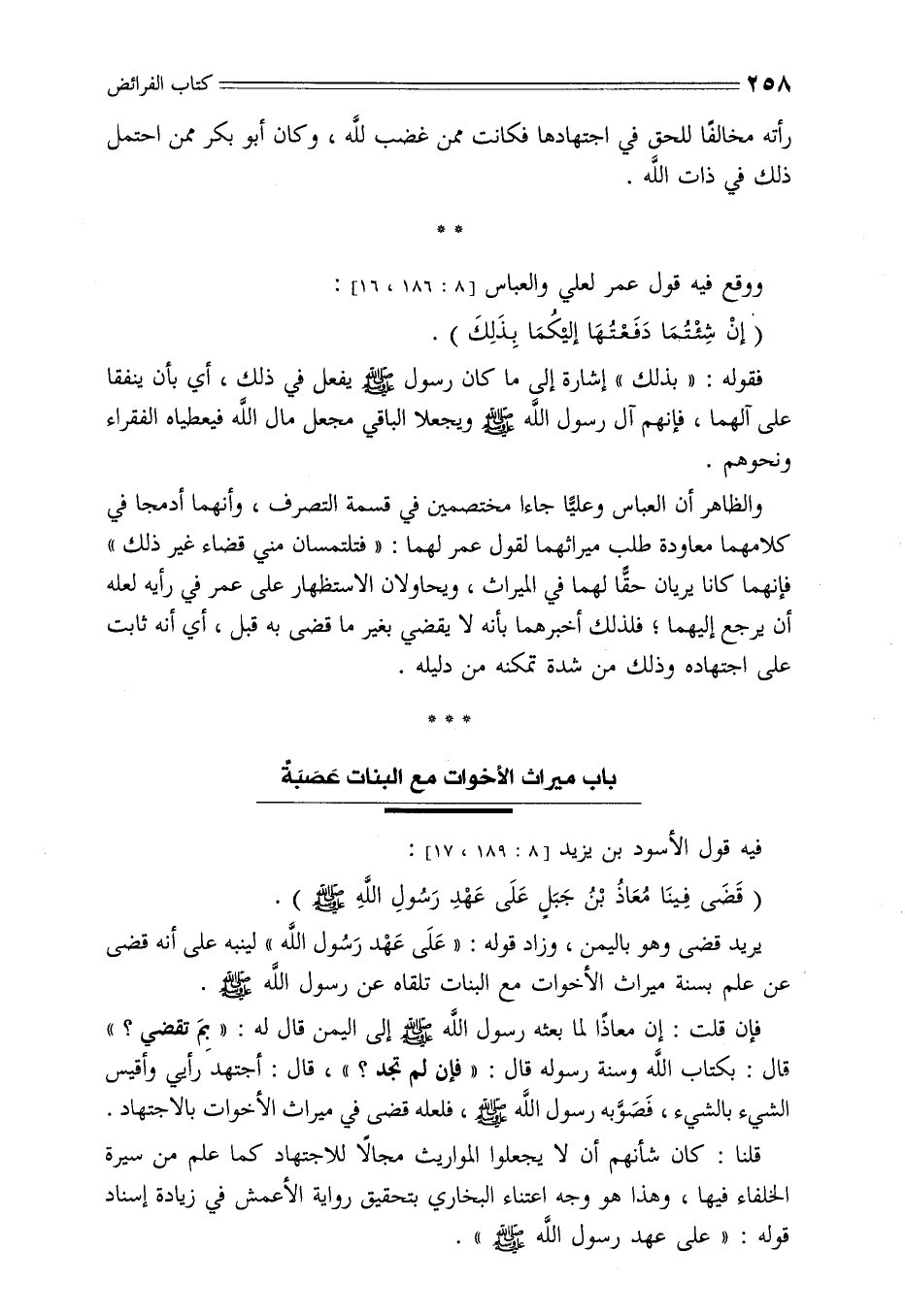 قلنا: كان شأنهم أن لا يجعلوا المواريث مجالًا للاجتهاد كما علم من سيرة الخلفاء فيها، وهذا هو وجه اعتناء البخاري بتحقيق رواية الأعمش في زيادة إسناد قوله: «على عهد رسول الله - صلى الله عليه وسلم -».