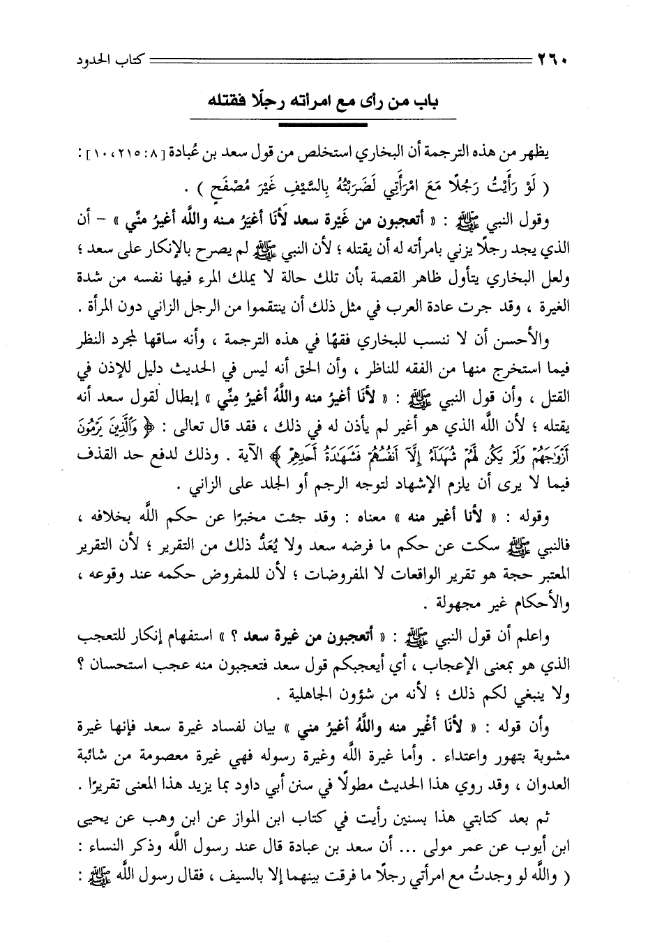 والأحسن أن لا ننسب للبخاري فقهًا في هذه الترجمة، وأنه ساقها لمجرد النظر فيما استخرج منها من الفقه للناظر، وأن الحق أنه ليس في الحديث دليل للإذن في القتل، وأن قول النبي - صلى الله عليه وسلم -: «لأنَا أغيرُ منه واللهُ أغيرُ مِنِّي» إبطال لقول سعد أنه يقتله؛ لأن الله الذي هو أغير لم يأذن له في ذلك، فقد قال تعالى: {والَّذِينَ يَرْمُونَ أَزْوَاجَهُمْ ولَمْ يَكُن لَّهُمْ شُهَدَاءُ إلاَّ أَنفُسُهُمْ فَشَهَادَةُ أَحَدِهِمْ} الآية. وذلك لدفع حد القذف فيما لا يرى أن يلزم الإشهاد لتوجه الرجم أو الجلد على الزاني.