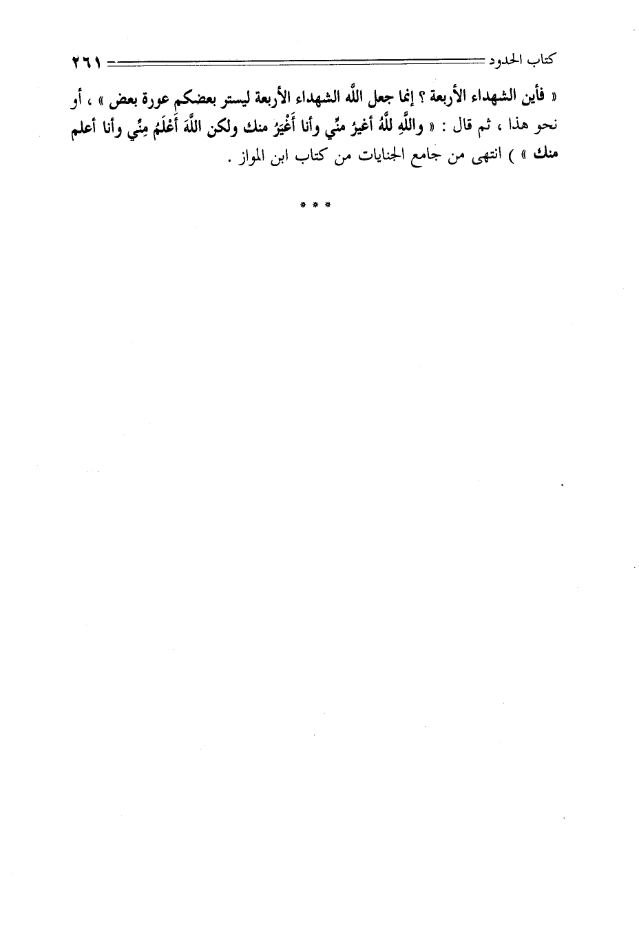 «فأين الشهداء الأربعة؟ إنما جعل الله الشهداء الأربعة ليستر بعضكم عورة بعض»، أو نحو هذا، ثم قال: «والله لله أغير منِّي وأنا أغير منك ولكن الله أعلم منِّي وأنا أعلم منك») انتهى من جامع الجنايات من كتاب ابن المواز.