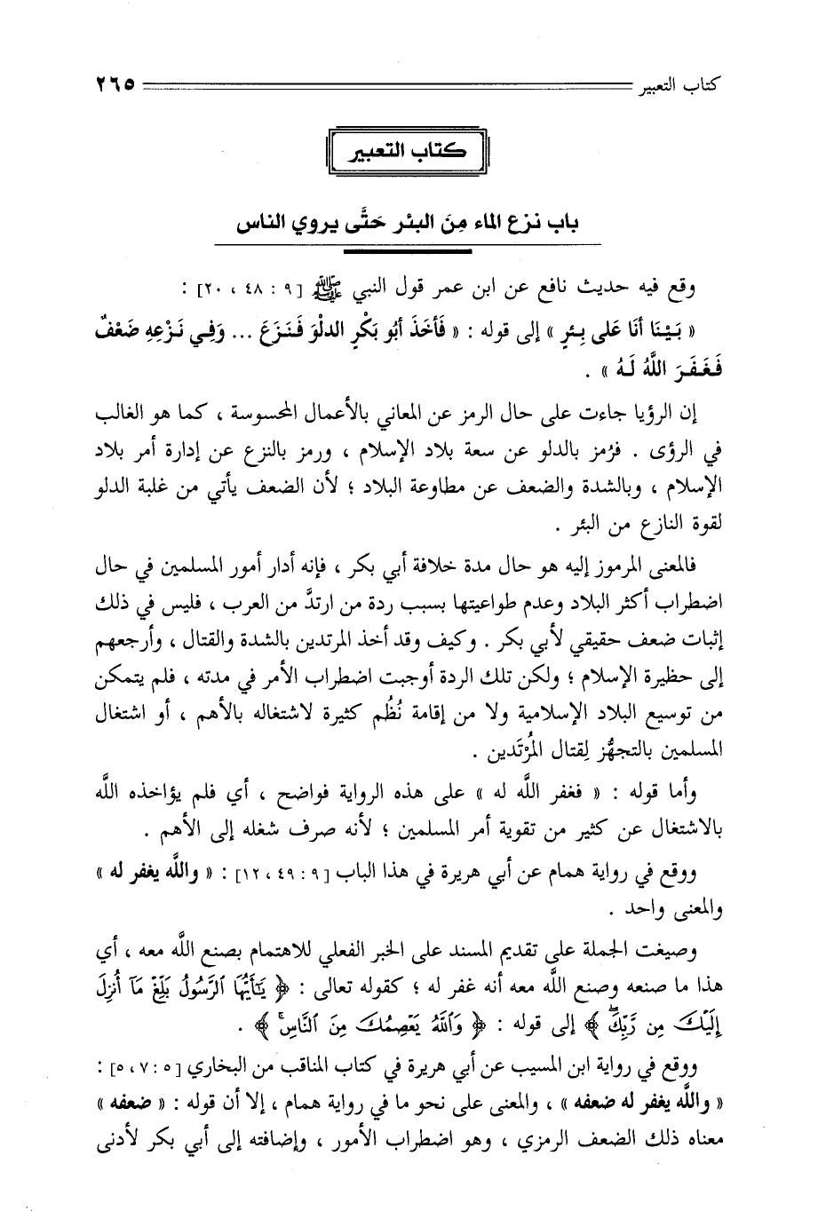 «بينا أنا على بئرٍ» إلى قوله: «فأخذ أبو بكرٍ الدلو فنزع ... وفي نزعه ضعفٌ فغفر الله له».
