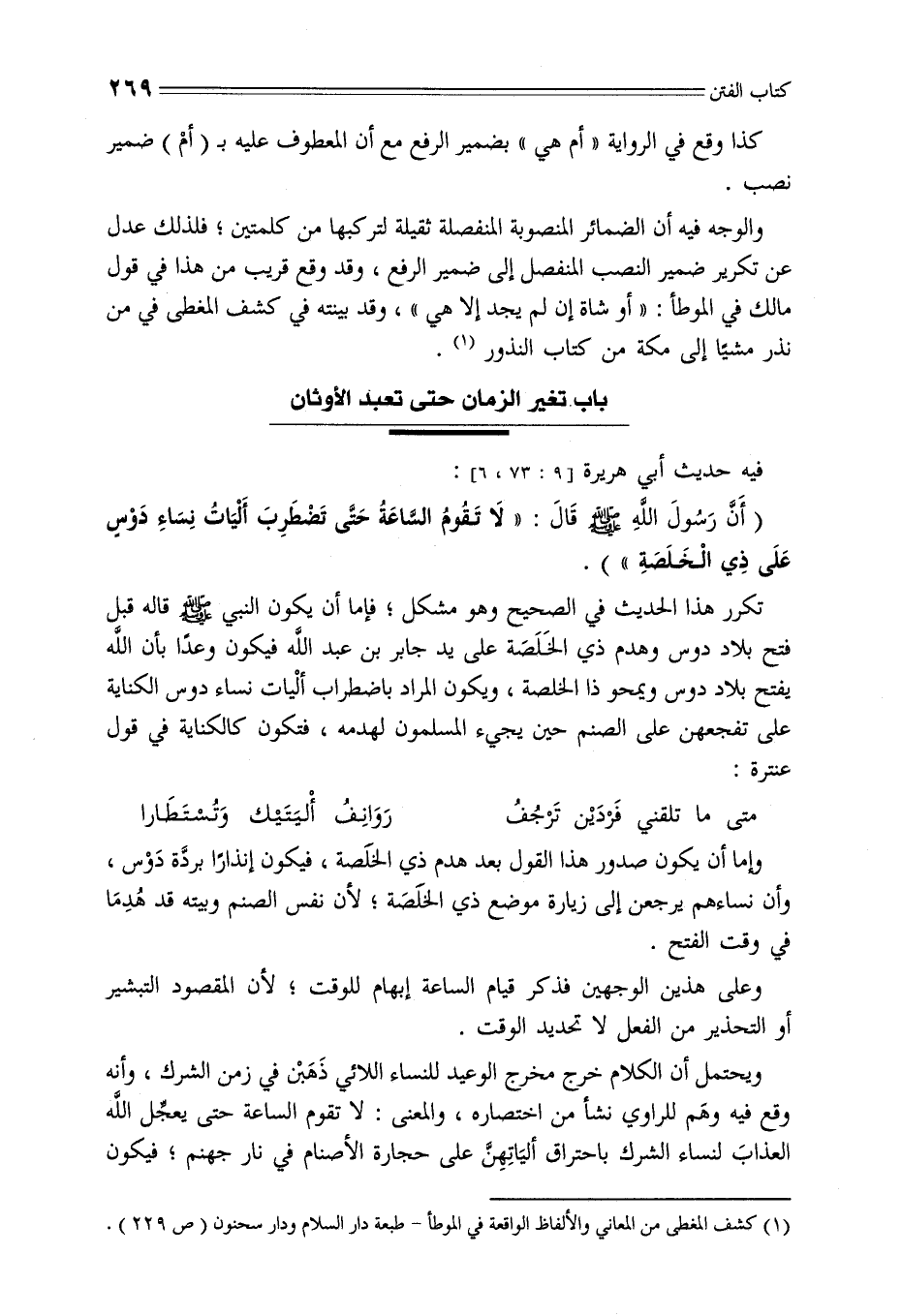 تكرر هذا الحديث في الصحيح وهو مشكل؛ فإما أن يكون النبي - صلى الله عليه وسلم - قاله قبل فتح بلاد دوس وهدم ذي الخَلَصَة على يد جابر بن عبد الله فيكون وعدًا بأن الله يفتح بلاد دوس ويمحو ذا الخلصة، ويكون المراد باضطراب ألْيات نساء دوس الكناية على تفجعهن على الصنم حين يجيء المسلمون لهدمه، فتكون كالكناية في قول عنترة:
