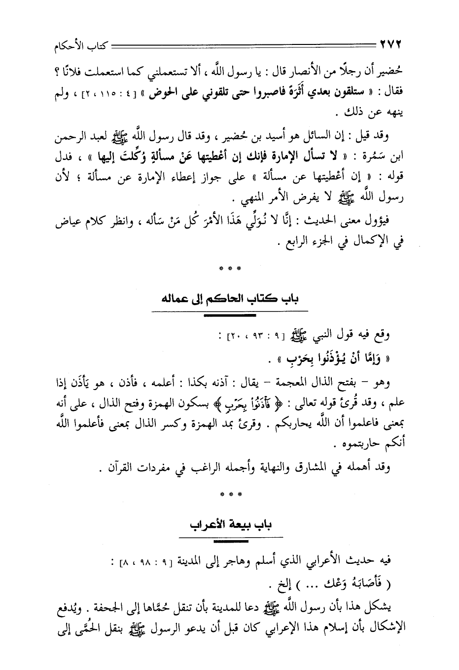 حُضير أن رجلًا من الأنصار قال: يا رسول الله، ألا تستعملني كما استعملت فلانًا؟ فقال: «ستلقون بعدي أَثَرَةً فاصبروا حتى تلقوني على الحوض» [115: 4، 2]، ولم ينهه عن ذلك.
