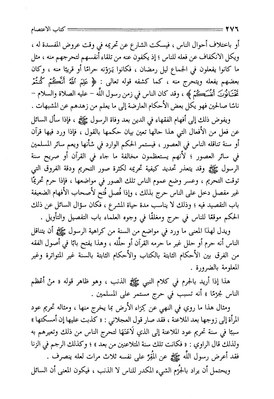 أو باختلاف أحوال الناس، فيسكت الشارع عن تحريمه في وقت عروض المفسدة له، ويكل الانكفاف عن فعله للناس؛ إذ يكفون عنه من تلقاء أنفسهم لتحرجهم منه، مثل ما كانوا يفعلون في الجماع ليل رمضان، فكانوا يَرَوْنه حرامًا أو قريبًا منه، وكان بعضهم يفعله ويتحرج منه، كما كشفه قوله تعالى: {عَلِمَ اللَّهُ أَنَّكُمْ كُنتُمْ تَخْتَانُونَ أَنفُسَكُمْ}، وقد كان الناس في زمن رسول الله -عليه الصلاة والسلام - ناسًا صالحين فهو يكل بعض الأحكام العارضة إلى ما يعلم من زهدهم عن المشبهات.