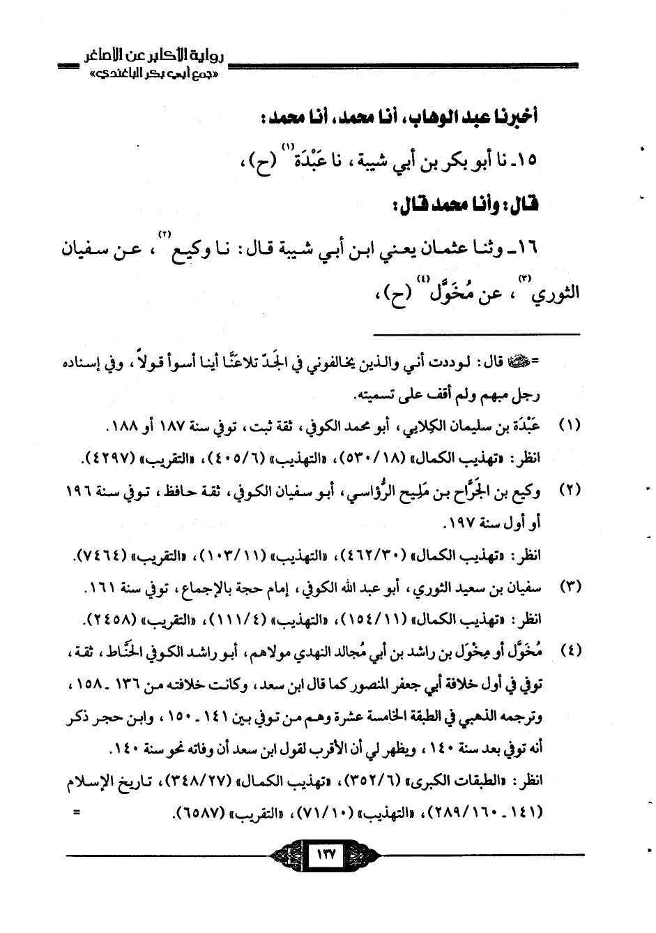 16- قال: وأنا محمد قال: وثنا عثمان يعني ابن أبي شيبة قال: نا وكيع، عن سفيان الثوري، عن مخول (ح) ،