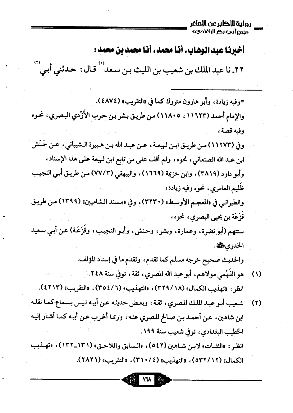22- أخبرنا عبد الوهاب، أنا محمد، أنا محمد بن محمد: نا عبد الملك بن شعيب بن الليث بن سعد قال: حدثني أبي -[169]- قال: حدثني [أبي] الليث بن سعد قال: حدثني يزيد بن أبي حبيب، عن بكير بن عبد الله بن الأشج، عن نايلٍ صاحب العباء، عن عبد الله بن عمر رضي الله عنه، عن صهيب رضي الله عنه: أنه سلم على النبي صلى الله عليه وسلم وهو يصلي؛ فرد صلى الله عليه وسلم عليه إشارة.