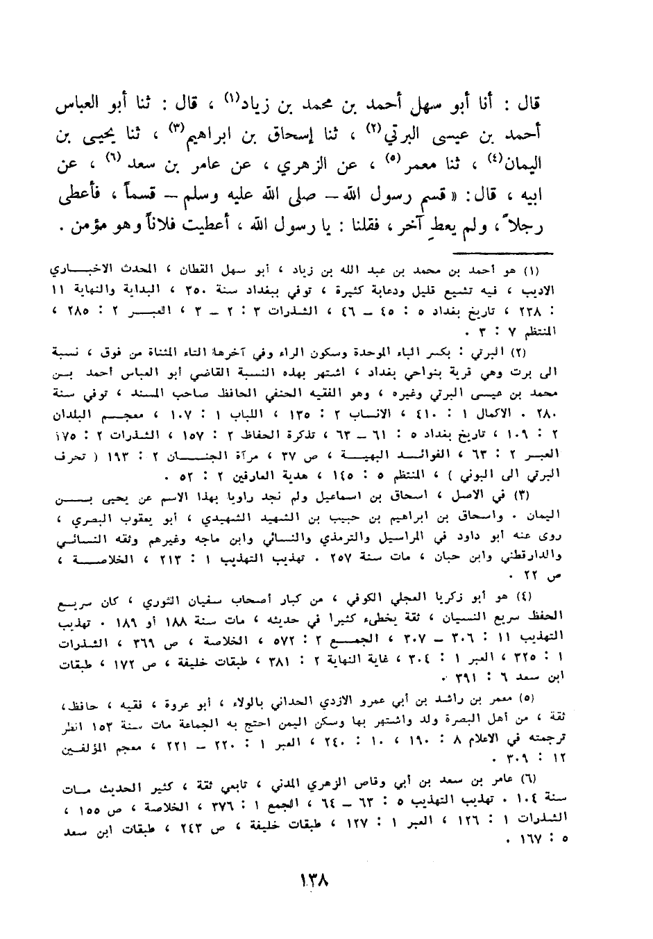 قَالَ: أنا أَبُو سَهْلٍ أَحْمَدُ بْنُ مُحَمَّدِ بْنِ زِيَادٍ، قَالَ: ثنا أَبُو الْعَبَّاسِ أَحْمَدُ بْنُ عِيسَى الْبِرْتِيُّ، ثنا إِسْحَاقُ بْنُ إِبْرَاهِيمَ، ثنا يَحْيَى بْنُ الْيَمَانِ، ثنا مَعْمَرٌ، عَنِ الزُّهْرِيِّ، عَنْ عَامِرِ بْنِ سَعْدٍ، عَنْ أَبِيهِ، قَالَ: قَسَّمَ رَسُولُ اللَّهِ صَلَّى اللَّهُ عَلَيْهِ وَسَلَّمَ قِسْمًا، فَأَعْطَى رَجُلا، وَلَمْ يُعْطِ آخَرًا، فَقُلْنَا: يَا رَسُولَ اللَّهِ، أَعْطَيْتُ فُلانًا وَهُوَ مُؤْمِنٌ.