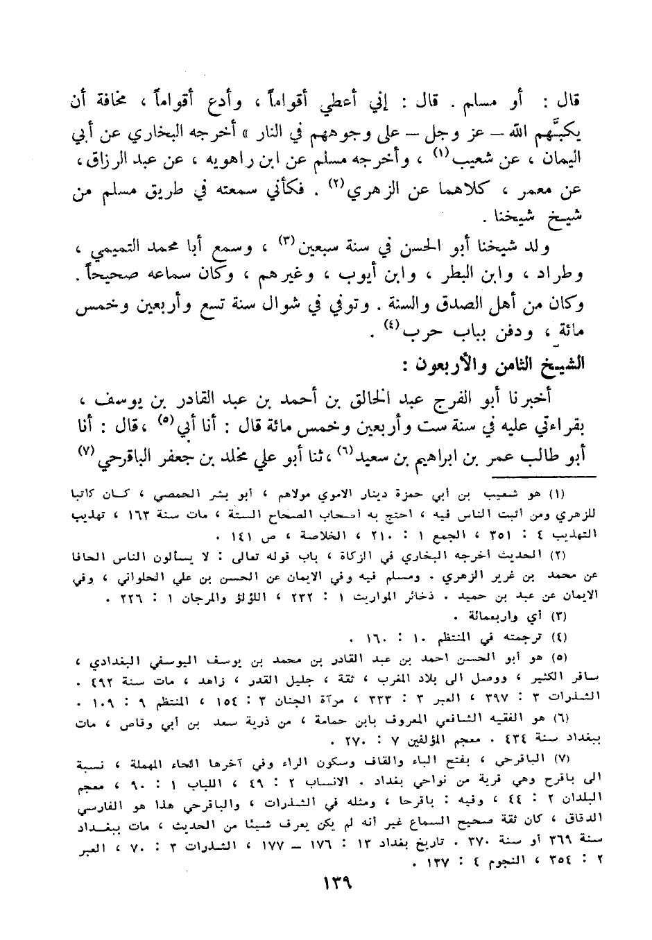 أَخْبَرَنَا أَبُو الْفَرَجِ عَبْدُ الْخَالِقِ بْنُ أَحْمَدَ بْنِ عَبْدِ الْقَادِرِ بْنِ يُوسُفَ، بِقِرَاءَتِي عَلَيْهِ فِي سَنَةِ سِتٍّ وَأَرْبَعِينَ وَخَمْسِ مِائَةٍ قَالَ: أنا أَبِي، قَالَ: أنا أَبُو طَالِبٍ عُمَرُ بْنُ إِبْرَاهِيمَ بْنِ سَعِيدٍ، ثنا أَبُو عَلِيٍّ مَخْلَدُ بْنُ جَعْفَرٍ الْبَاقَرْحِيُّ،