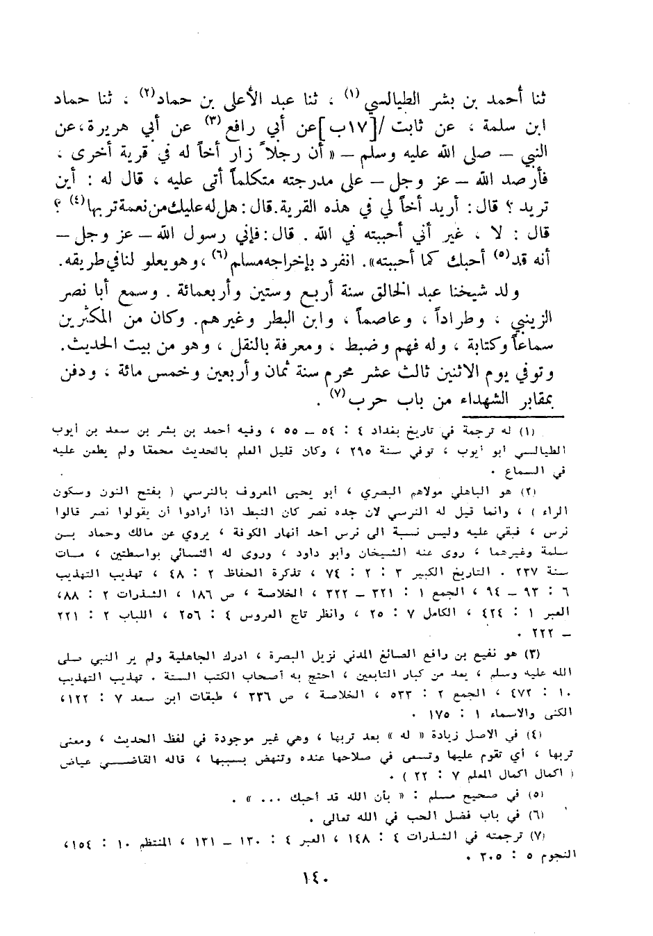 ثنا أَحْمَدُ بْنُ بِشْرٍ الطَّيَالِسِيُّ، ثنا عَبْدُ الأَعْلَى بْنُ حَمَّادٍ، ثنا حَمَّادُ بْنُ سَلَمَةَ، عَنْ ثَابِتٍ، عَنْ أَبِي رَافِعٍ، عَنْ أَبِي هُرَيْرَةَ، عَنِ النَّبِيِّ صَلَّى اللَّهُ عَلَيْهِ وَسَلَّمَ: أَنَّ رَجُلا زَارَ أَخًا لَهُ فِي قَرْيَةٍ أُخْرَى، فَأَرصَدَ اللَّهُ عَزَّ وَجَلَّ عَلَى مِدْرَجَتِهِ مُتَكَلِّمًا أَتَى عَلَيْهِ، قَالَ لَهُ: أَيْنَ تُرِيدَ؟ قَالَ: أُرِيدُ أَخًا لِي فِي هَذِهِ الْقَرْيَةِ.