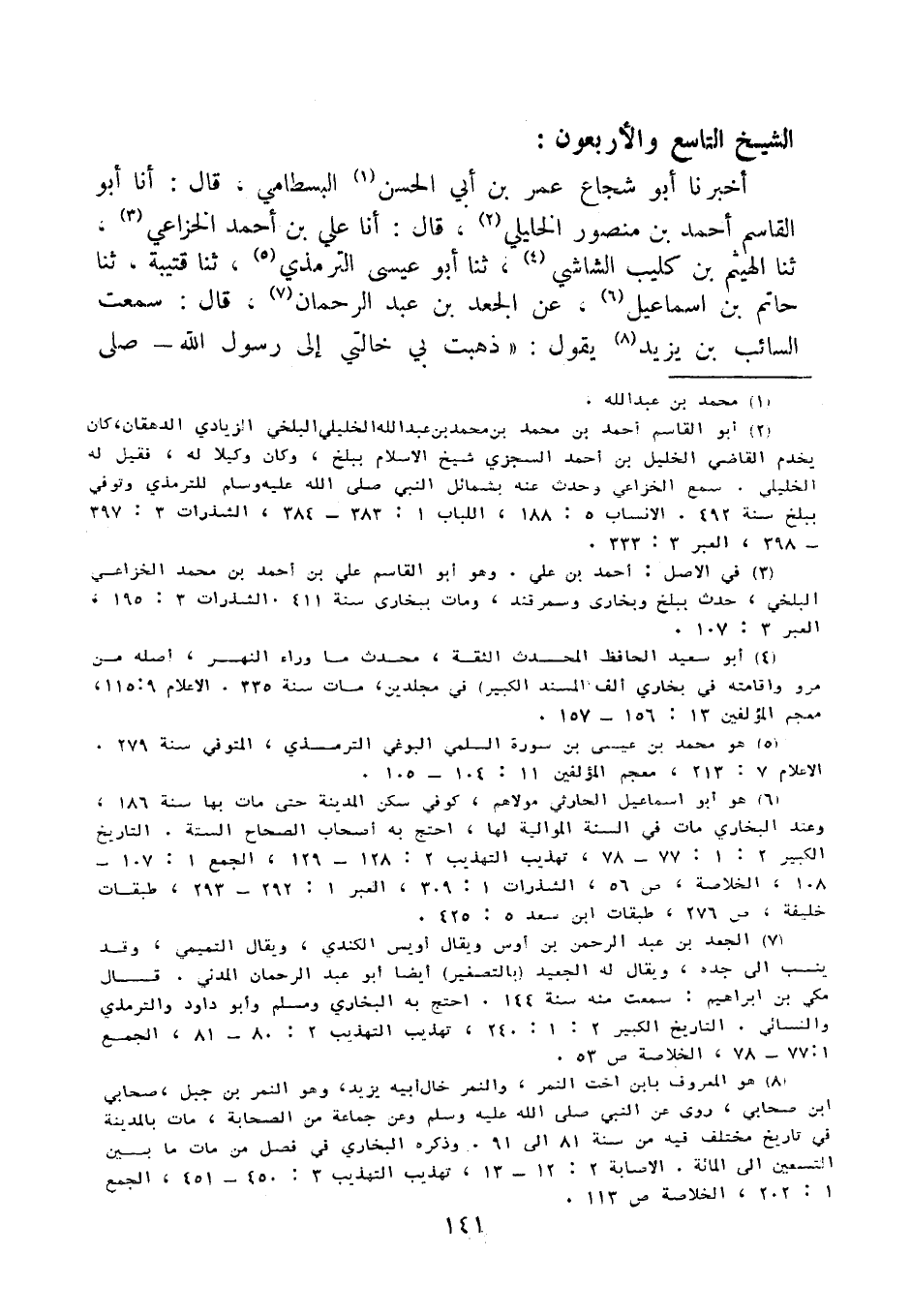 أَخْبَرَنَا أَبُو شُجَاعٍ عُمَرُ بْنُ أَبِي الْحَسَنِ الْبِسْطَامِيُّ، قَالَ: أنا أَبُو الْقَاسِمِ أَحْمَدُ بْنُ مَنْصُورٍ الْخَلِيلِيُّ، قَالَ: أنا عَلِيُّ بْنُ أَحْمَدَ الْخُزَاعِيُّ، ثنا الْهَيْثَمُ بْنُ كُلَيْبٍ الشَّاشِيُّ، ثنا أَبُو عِيسَى التِّرْمِذِيُّ، ثنا قُتَيْبَةُ، ثنا حَاتِمُ بْنُ إِسْمَاعِيلَ، عَنِ الْجَعْدِ بْنِ عَبْدِ الرَّحْمَنِ، قَالَ: سَمِعْتُ السَّائِبَ بْنَ يَزِيدَ يَقُولُ: ذَهَبَتْ بِي خَالَتِي إِلَى رَسُولِ اللَّهِ صَلَّى