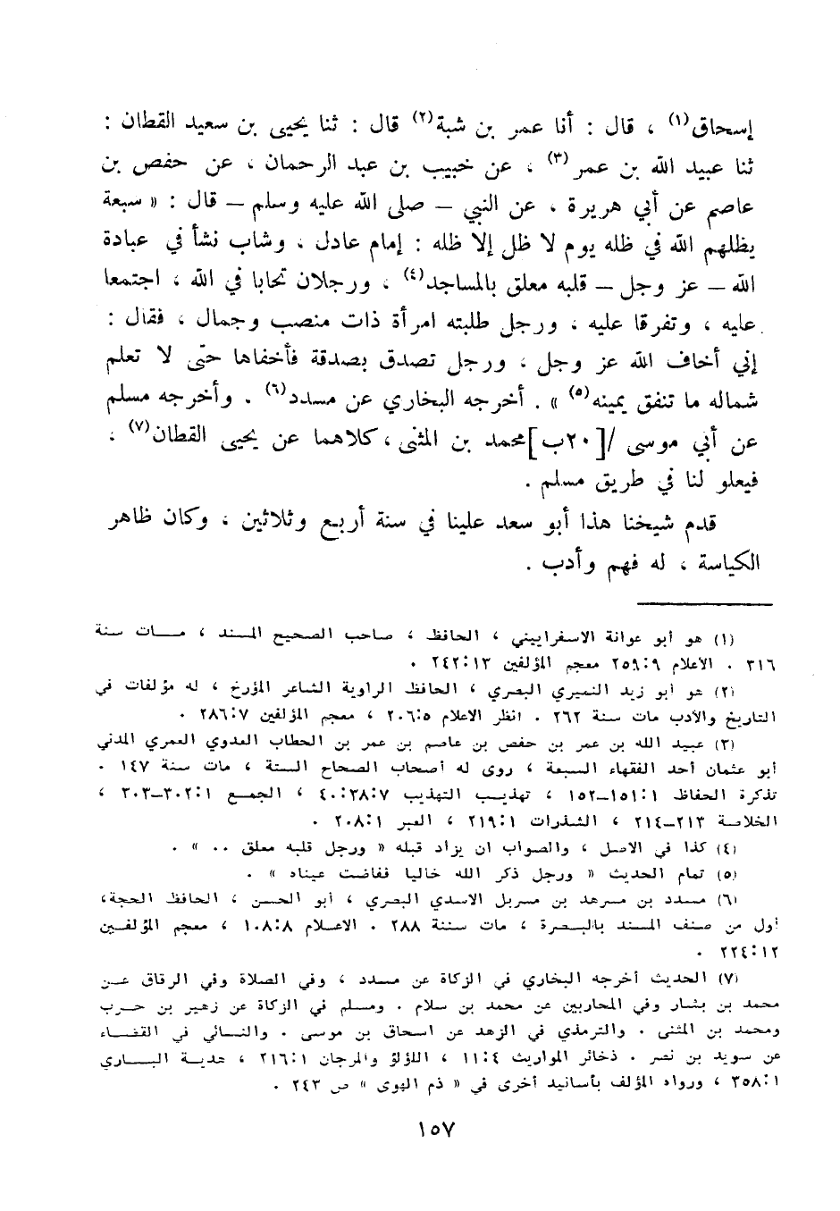 إِسْحَاقَ، قَالَ: أنا عُمَرُ بْنُ شَبَّةَ، قَالَ: ثنا يَحْيَى بْنُ سَعِيدٍ الْقَطَّانُ: ثنا عُبَيْدُ اللَّهِ بْنُ عُمَرَ، عَنْ خُبَيْبِ بْنِ عَبْدِ الرَّحْمَنِ، عَنْ حَفْصِ بْنِ عَاصِمٍ، عَنْ أَبِي هُرَيْرَةَ، عَنِ النَّبِيِّ صَلَّى اللَّهُ عَلَيْهِ وَسَلَّمَ قَالَ: سَبْعَةٌ يُظِلُّهُمُ اللَّهُ فِي ظِلِّهِ يَوْمَ لا ظِلَّ إِلا ظِلُّهُ: إِمَامٌ عَادِلٌ، وَشَابٌّ نَشَأَ فِي عِبَادَةِ اللَّهِ عَزَّ وَجَلَّ، وَرَجُلٌ قَلْبُهُ مُعَلَّقٌ بِالْمَسَاجِدِ، وَرَجُلانِ تَحَابَّا فِي اللَّهِ، اجْتَمَعَا عَلَيْهِ، وَتَفَرَّقَا عَلَيْهِ، وَرَجُلٌ طَلَبَتْهُ امْرَأَةٌ ذَاتُ مَنْصِبٍ وَجَمَالٍ، فَقَالَ: إِنِّي أَخَافُ اللَّهَ عَزَّ وَجَلَّ، وَرَجُلٌ تَصَدَّقَ بِصَدَقَةٍ فَأَخْفَاهَا حَتَّى لا تَعْلَمَ شِمَالُهُ مَا تُنْفِقُ يَمِينُهُ.
