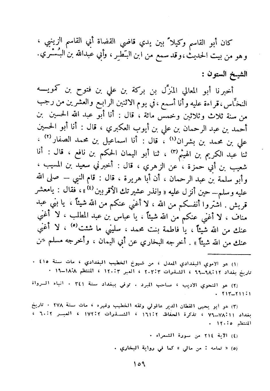 أَخْبَرَنَا أَبُو الْمَعَالِي الْمُنْزِلُ بْنُ بَرَكَةَ بْنِ عَلِيِّ بْنِ فُتُوحِ بْنِ كَمَوَيْهِ النَّخَّاسُ، قِرَاءَةً عَلَيْهِ وَأَنَا أَسْمَعُ، فِي يَوْمِ الإِثْنَيْنِ الرَّابِعِ وَالْعِشْرِينَ مِنْ رَجَبٍ مِنْ سَنَةِ ثَلاثٍ وَثَلاثِينَ وَخَمْسِ مِائَةٍ، قَالَ: أنا أَبُو عَبْدِ اللَّهِ الْحُسَيْنُ بْنُ أَحْمَدَ بْنِ عَبْدِ الرَّحْمَنِ بْنِ عَلِيِّ بْنِ أَيُّوبَ الْعُكْبَرِيُّ، قَالَ: أنا أَبُو الْحُسَيْنِ عَلِيُّ بْنُ مُحَمَّدِ بْنِ بِشْرَانَ، قَالَ: أنا إِسْمَاعِيلُ بْنُ مُحَمَّدٍ الصَّفَّارُ، ثنا عَبْدُ الْكَرِيمِ بْنُ الْهَيْثَمِ، ثنا أَبُو الْيَمَانِ الْحَكَمُ بْنُ نَافِعٍ، قَالَ: أنا شُعَيْبُ بْنُ أَبِي حَمْزَةَ، عَنِ الزُّهْرِيِّ، قَالَ: أَخْبَرَنِي سَعِيدُ بْنُ الْمُسَيِّبِ، وَأَبُو سَلَمَةَ بْنُ عَبْدِ الرَّحْمَنِ، أَنَّ أَبَا هُرَيْرَةَ قَالَ: قَامَ النَّبِيُّ صَلَّى اللَّهُ عَلَيْهِ وَسَلَّمَ حِينَ أُنْزِلَ عَلَيْهِ: {وَأَنْذِرْ عَشِيرَتَكَ الأَقْرَبِينَ} [الشعراء: 214] ، فَقَالَ: يَا مَعْشَرَ قُرَيْشٍ: اشْتَرُوا أَنْفُسَكُمْ مِنَ اللَّهِ، لا أُغْنِي عَنْكُمْ مِنَ اللَّهِ شَيْئًا، يَا بَنِي عَبْدَ مَنَافٍ: لا أُغْنِي عَنْكُمْ مِنَ اللَّهِ شَيْئًا، يَا عَبَّاسُ بْنُ عَبْدِ الْمُطَّلِبِ: لا أُغْنِي عَنْكَ مِنَ اللَّهِ شَيْئًا، يَا فَاطِمَةُ بِنْتُ مُحَمَّدٍ: سَلِينِي مَا شِئْتِ، لا أُغْنِي عَنْكِ مِنَ اللَّهِ شَيْئًا.